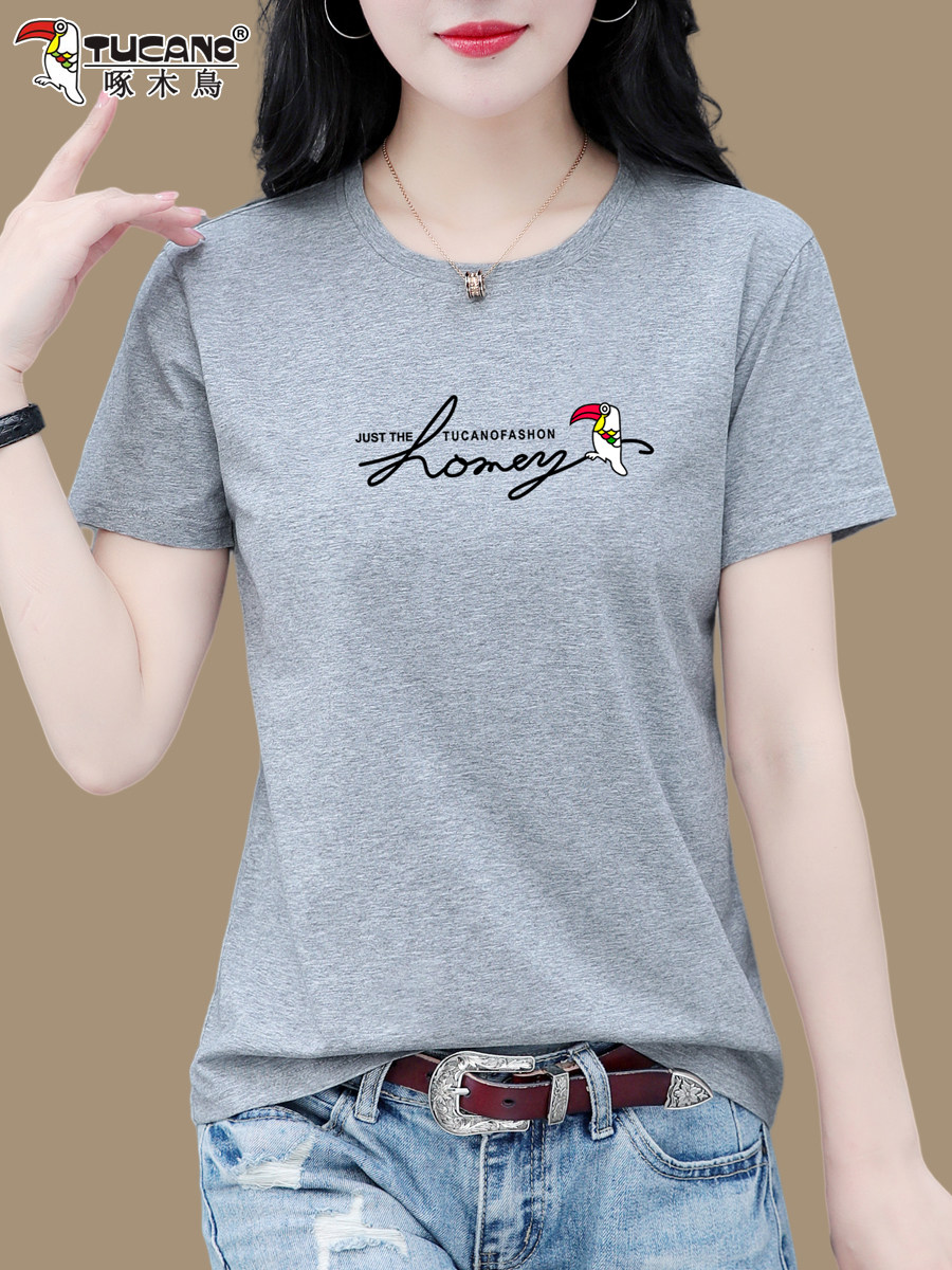 Woodpecker màu xám bông ngắn tay áo t-shirt cho phụ nữ mùa hè 2025 thời trang mới lỏng lẻo phù hợp với phụ nữ áo thun