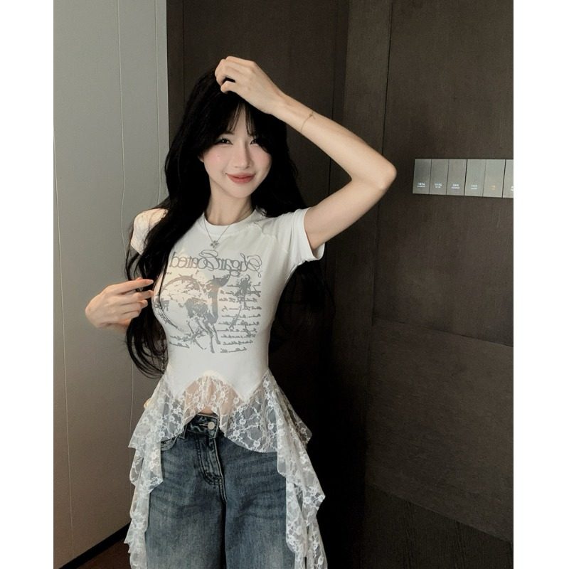 American sweet girl tuyệt đẹp áo thun ren vòng tay ngắn mùa hè phụ nữ in ấn và thiết kế áo khoác không đối xứng