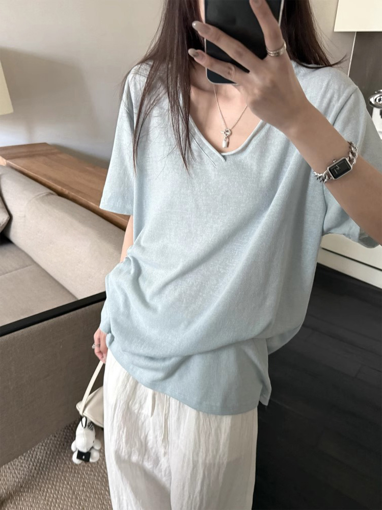 Thiết kế cổ V cổ vai áo sơ mi ngắn tay mùa hè năm 2025 phiên bản hàn quốc rộng lớn kích thước mỏng dạ dày áo khoác