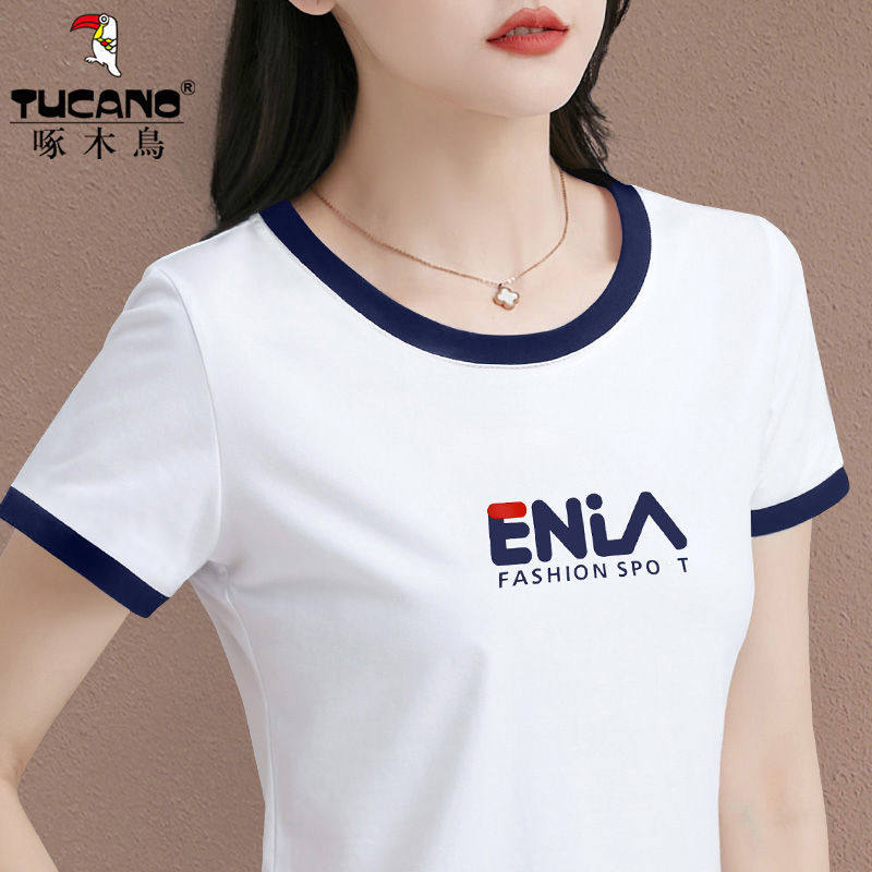 Woodpecker chính hãng bông ngắn tay áo t-shirt in cho phụ nữ năm 2024 mùa hè mới nổ mỏng vòng cổ nối