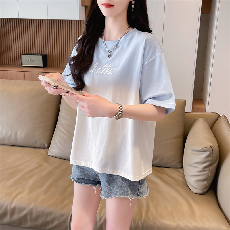 Dần dần màu tím bông t-shirt nữ ngắn tay 2025 phong cách mới mùa hè Mỹ thư thời trang lỏng lẻo ngắn trên quần áo