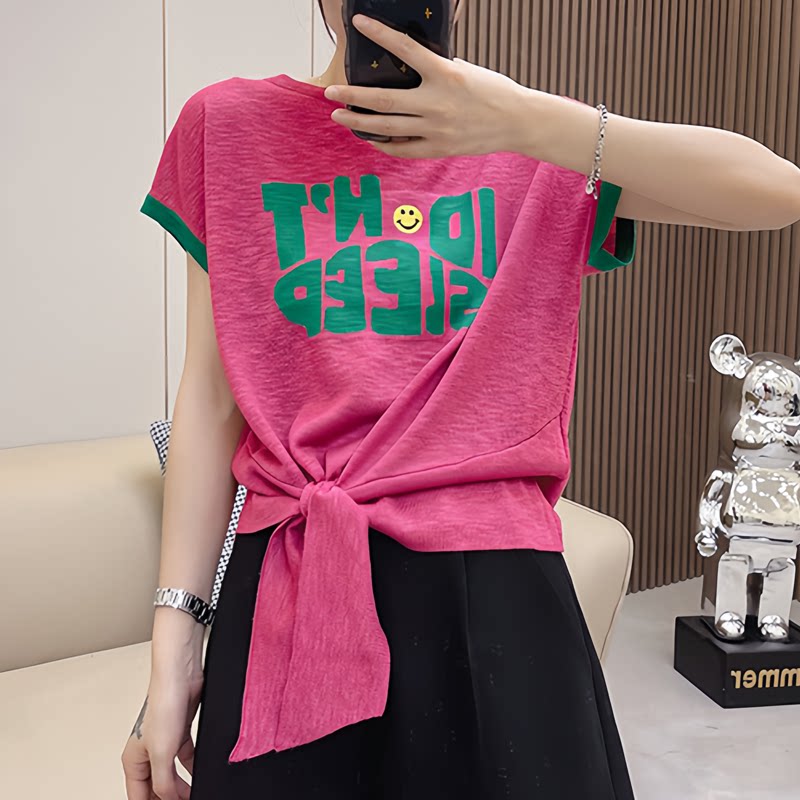 Sọc ngắn tay t-shirt in cho phụ nữ mùa hè 2025 mới phổ quát Mỹ thời trang Slim Look Casual Style Top