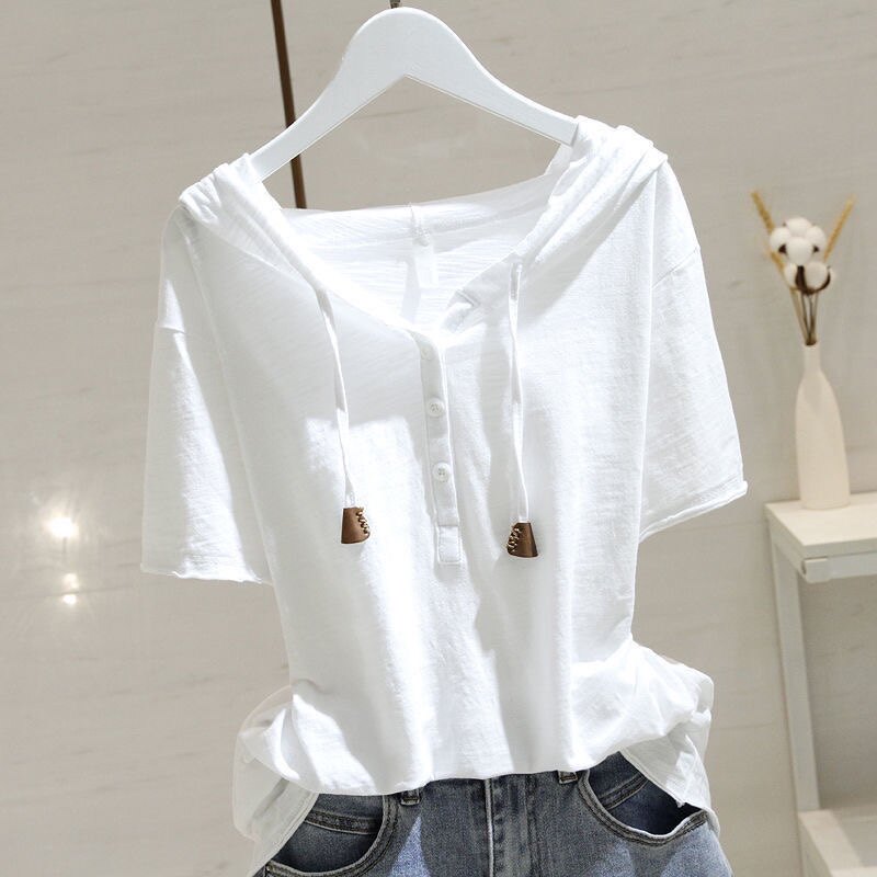 Áo sơ mi trắng đội mũ ngắn tay mùa xuân mùa hè năm 2025 người phụ nữ mới rộng, mỏng và đầy đủ áo thun của hàn quốc