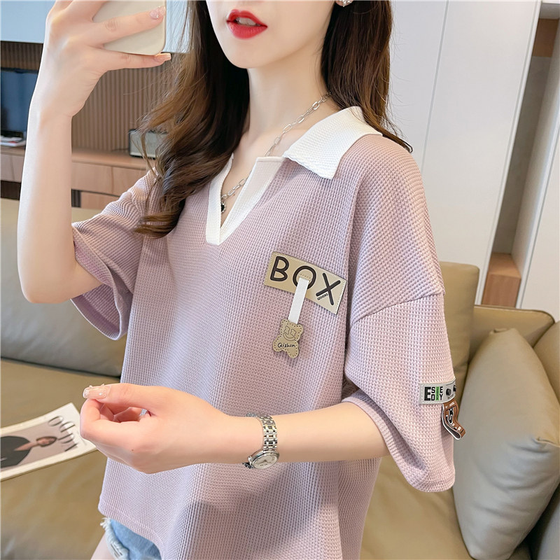 Màu sắc polo cổ áo sơ mi waffle ngắn tay áo mùa hè năm 2025 người phụ nữ rộng lượng hàn quốc cổ áo v thiết kế quần áo