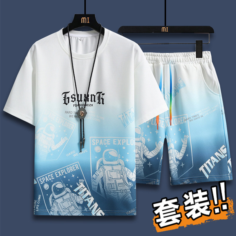 Thể thao giản dị phù hợp với nam giới mùa hè 2025 phong cách mới với thanh thiếu niên đẹp trai mùa hè phù hợp với băng lụa ngắn tay áo+quần short