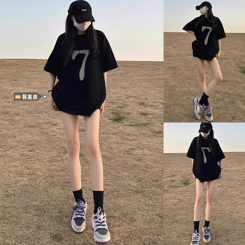 Cô gái mặc bộ đồ mùa hè rộng thùng thình, ngắn tay, thời trang, quần jean Hàn Quốc.