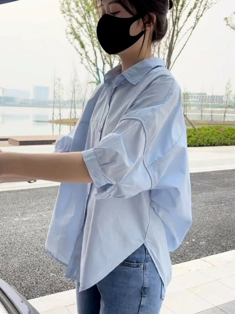 Hàn quốc búp bê màu xanh cổ áo sơ mi ngắn tay áo sơ mi mùa hè cao cấp vải sơ mi bay áo sơ mi ngắn tay áo