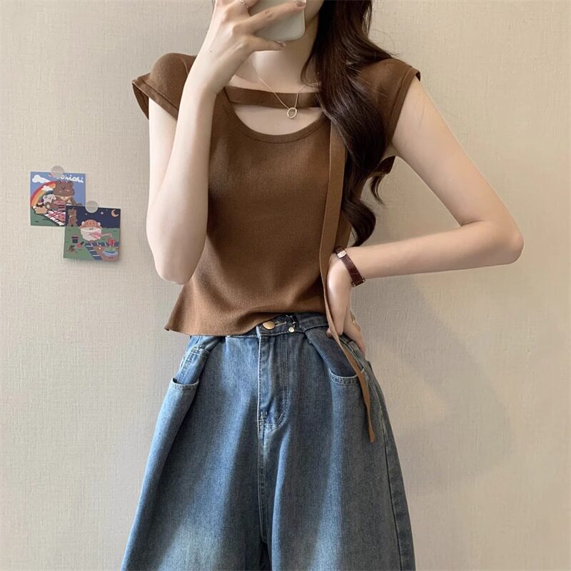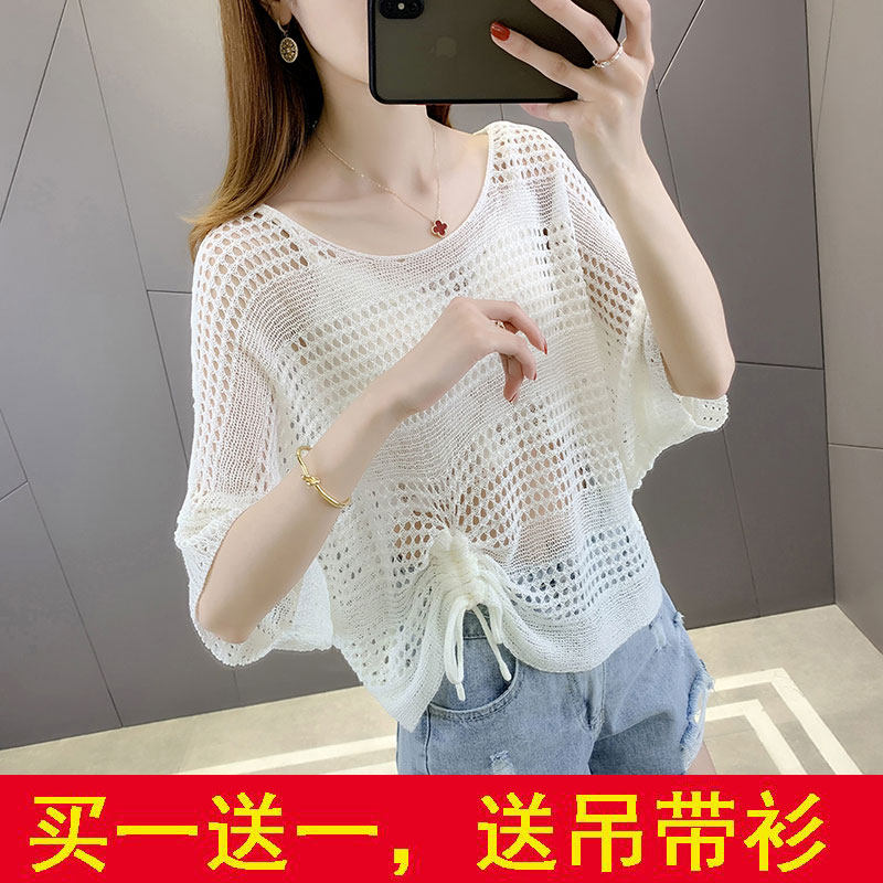 Cảm giác thiết kế nhỏ rỗng lỗ rách quần áo đan len mùa hè phụ nữ thư giãn mỏng bên ngoài làn sóng áo ngắn tay áo