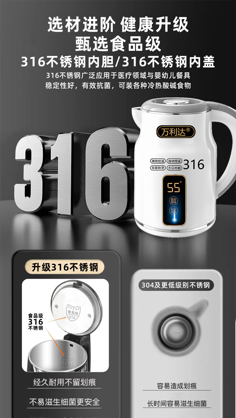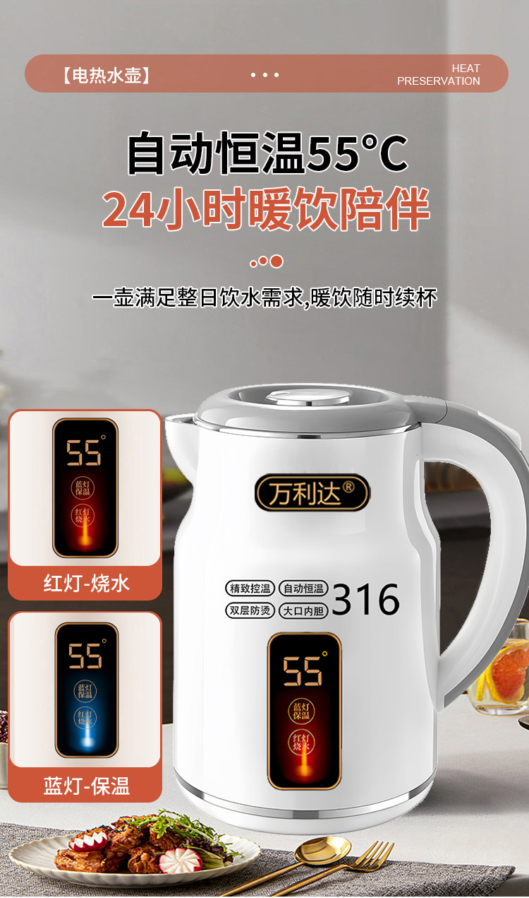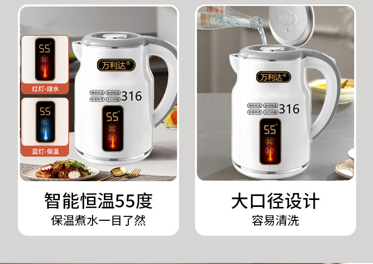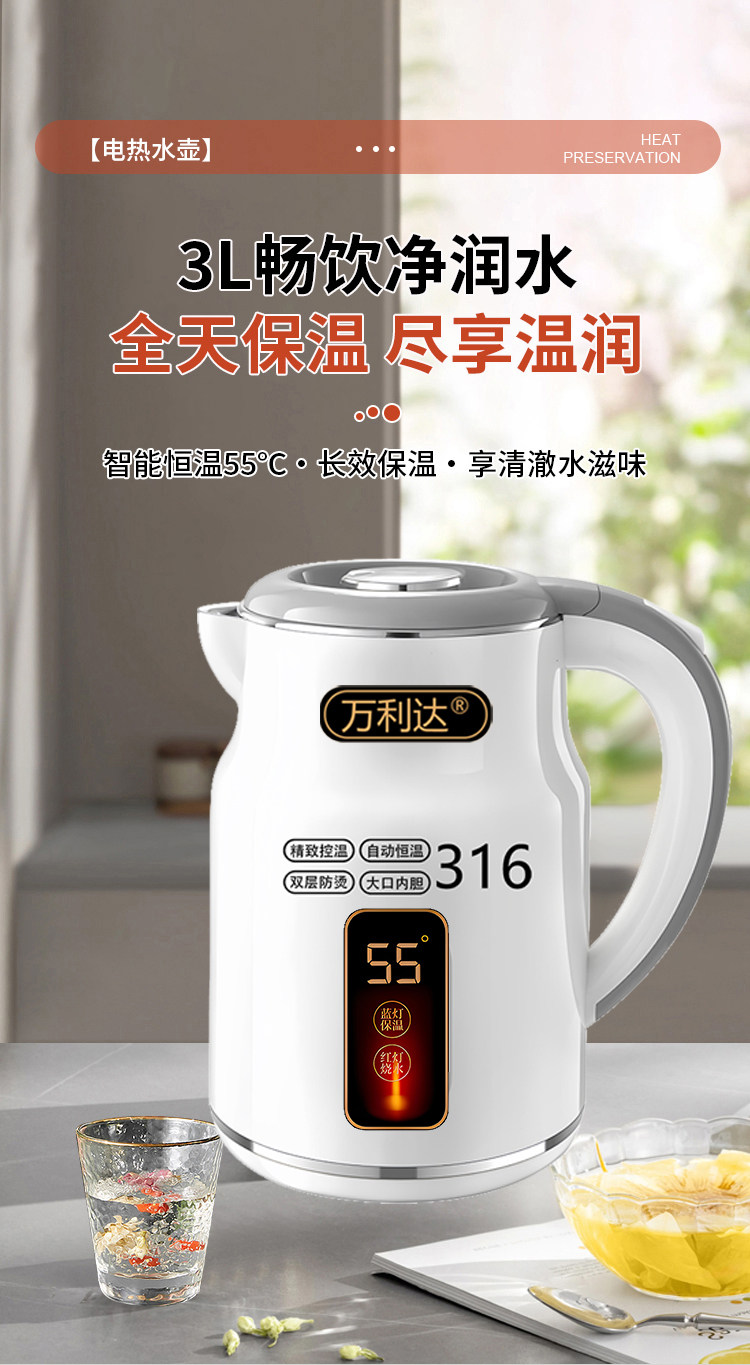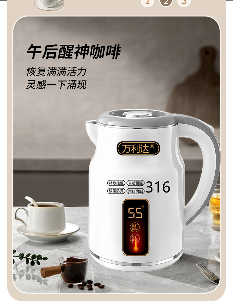 Wanlida ấm đun nước 316 thép không gỉ 3.0L khối lượng lớn nhiệt trong nhà nhiệt độ thông minh trong một ngày ấm đun nước