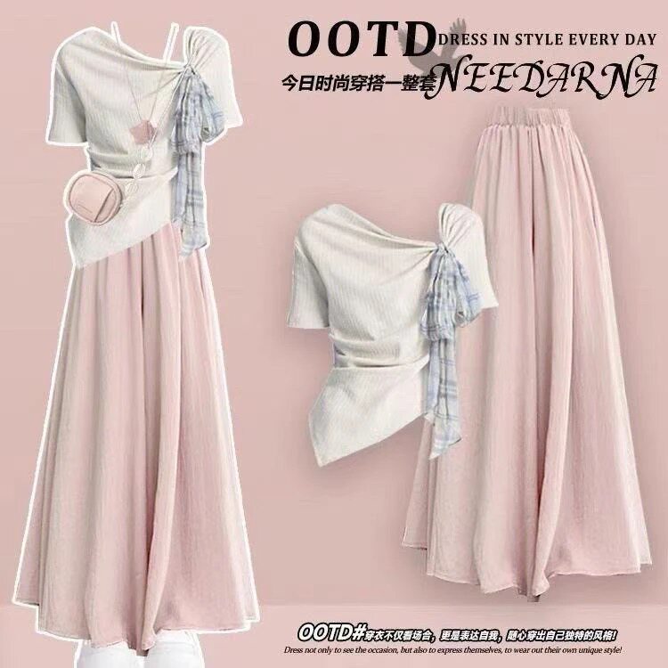 Dopamine vào mùa hè mặc một bộ áo sơ mi tay áo ngắn váy dài hai cô gái