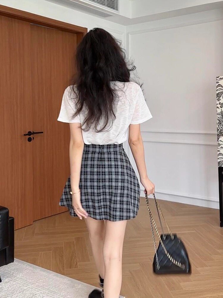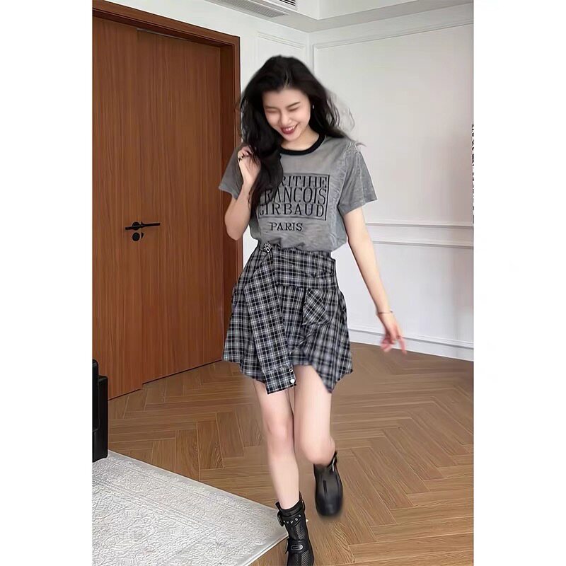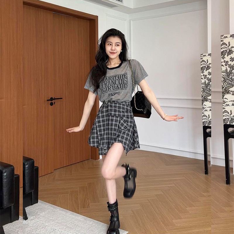 Mùa hè năm 2025 thiết kế chữ cái in áo thun ngắn tay cao eo mỏng bán thân váy hai mảnh phù hợp với phụ nữ