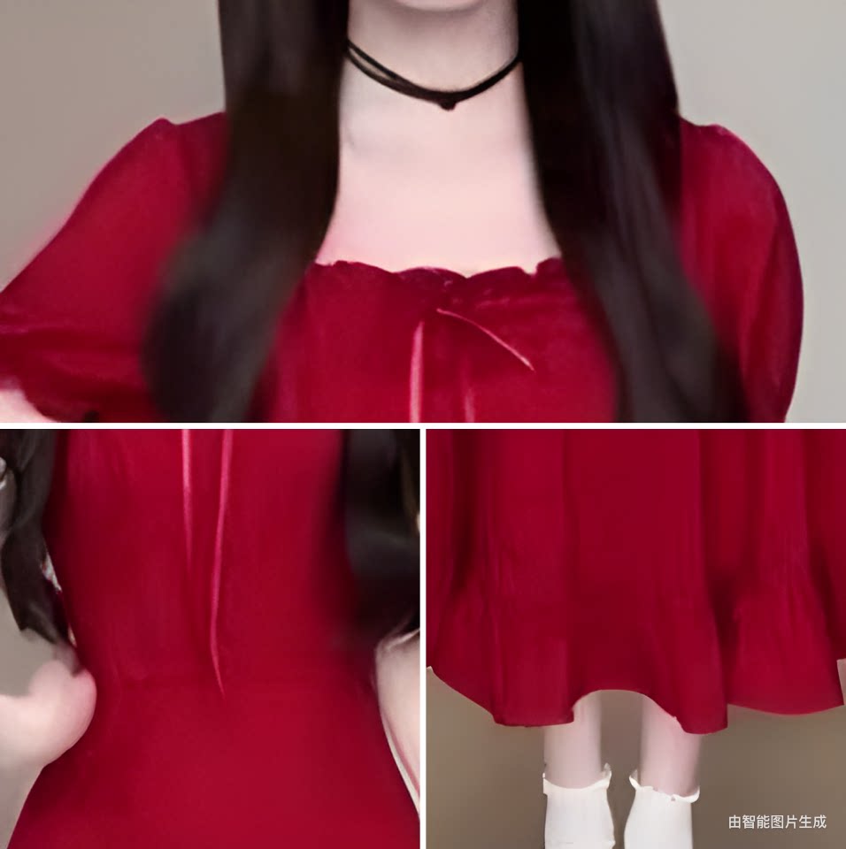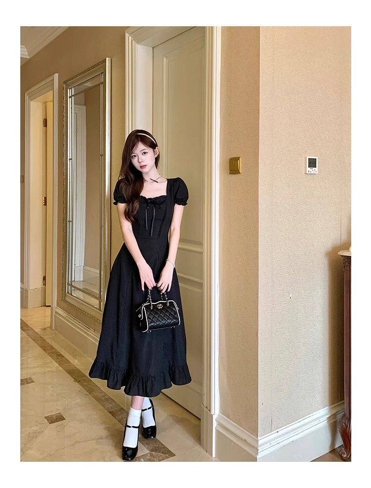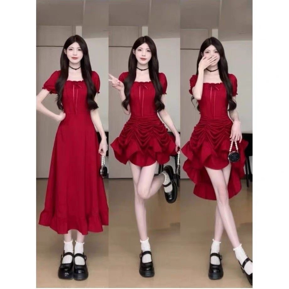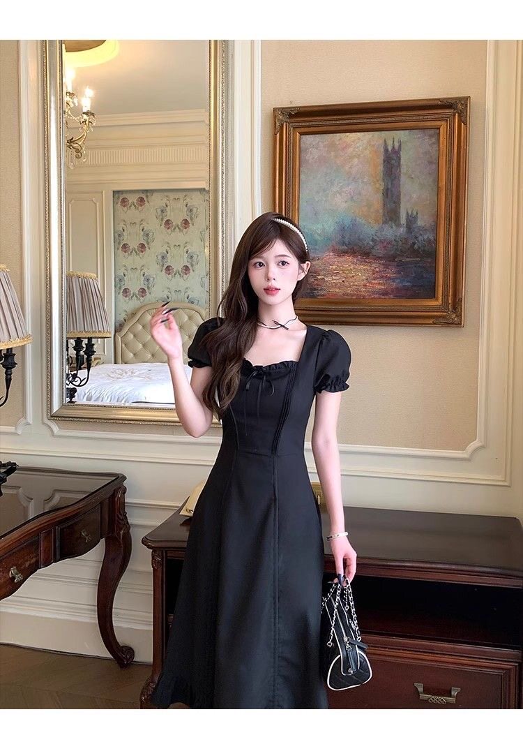 Phong cách pháp sexy cổ áo ngắn tay áo mùa hè cô gái thiết kế mới có thể mặc ba thắt lưng mỏng váy