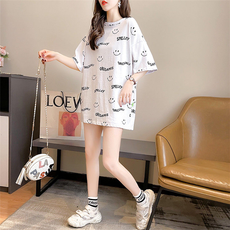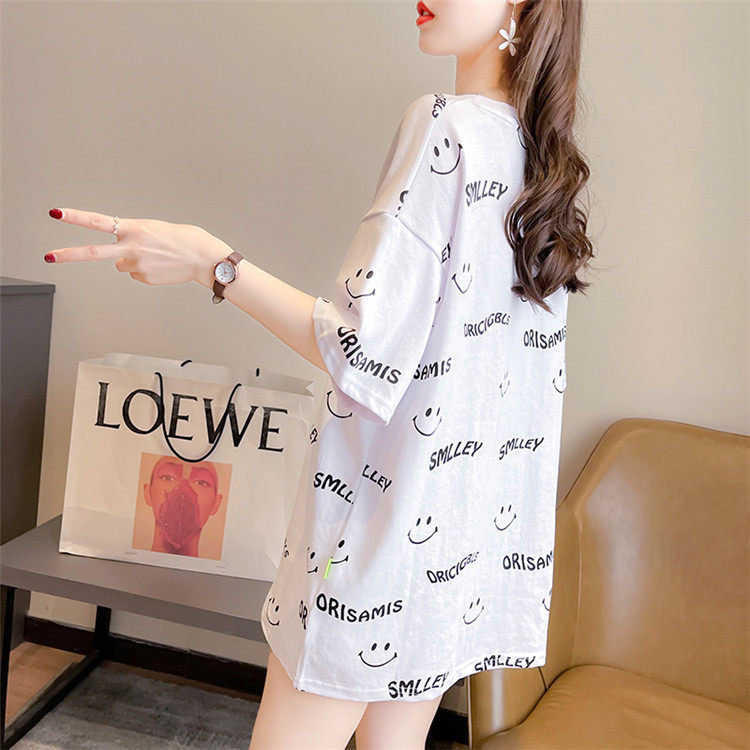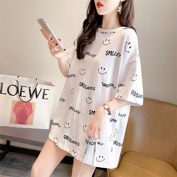 Mùa hè năm 2025 mới ngắn châu âu khuôn mặt cười in kích thước áo thun ngắn tay áo nữ hàn quốc túi quần áo nữ triều tiên