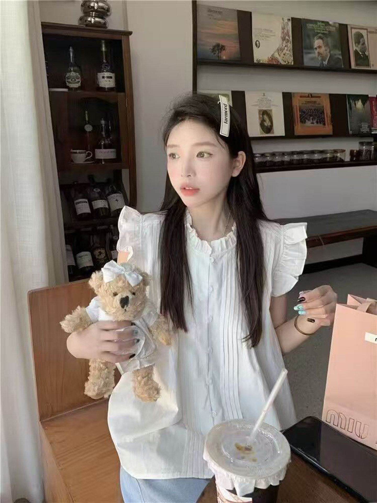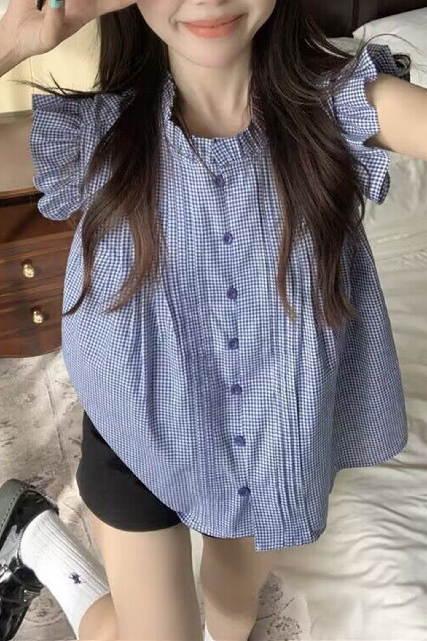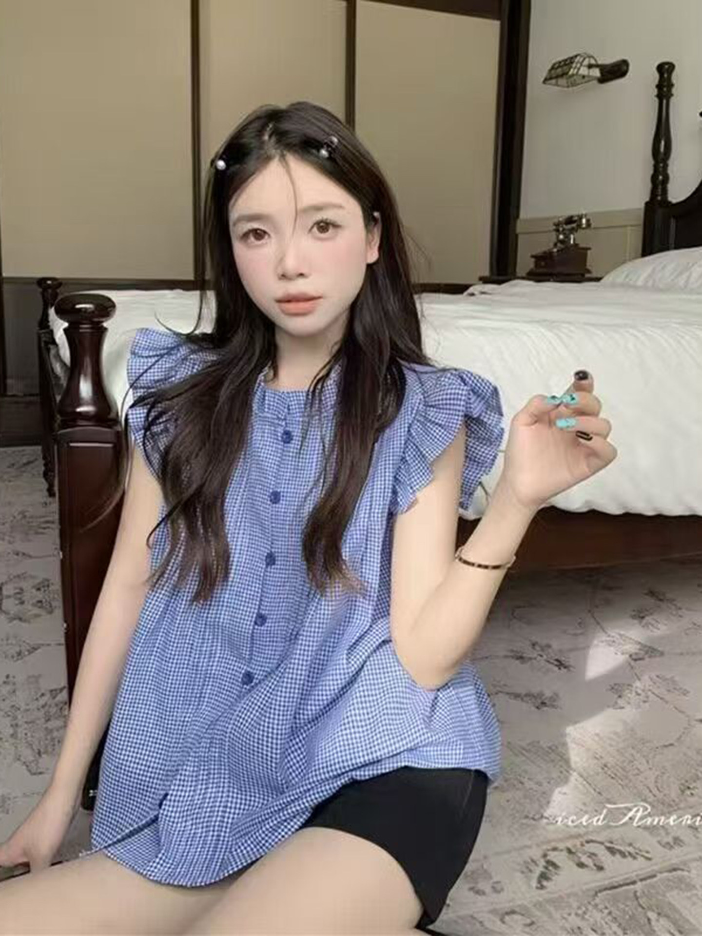 Mùa hè nhỏ người cao áo sơ mi pháp màu xanh sọc bay áo sơ mi ngắn con búp bê sơ mi