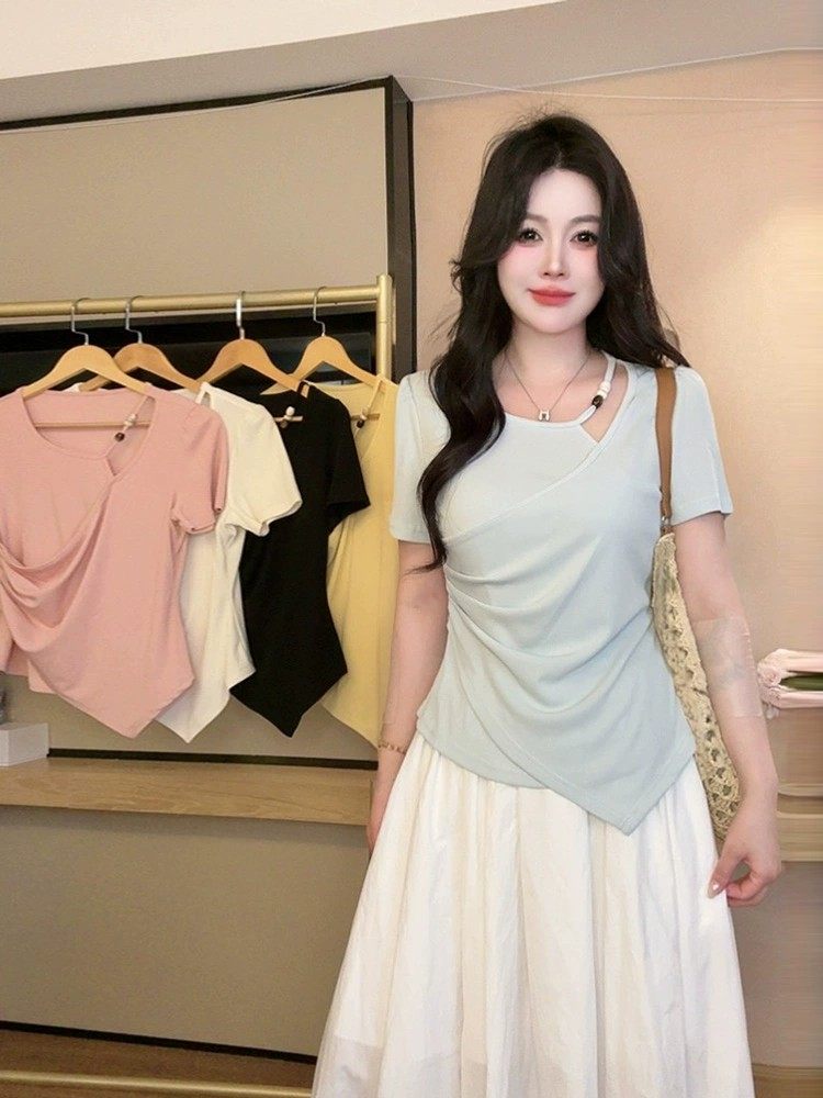 Kích thước lớn của quần áo phụ nữ mũm mĩm pháp thiết kế áo thun bất thường thắt lưng ngắn tay cô shayi thịt mỏng áo khoác
