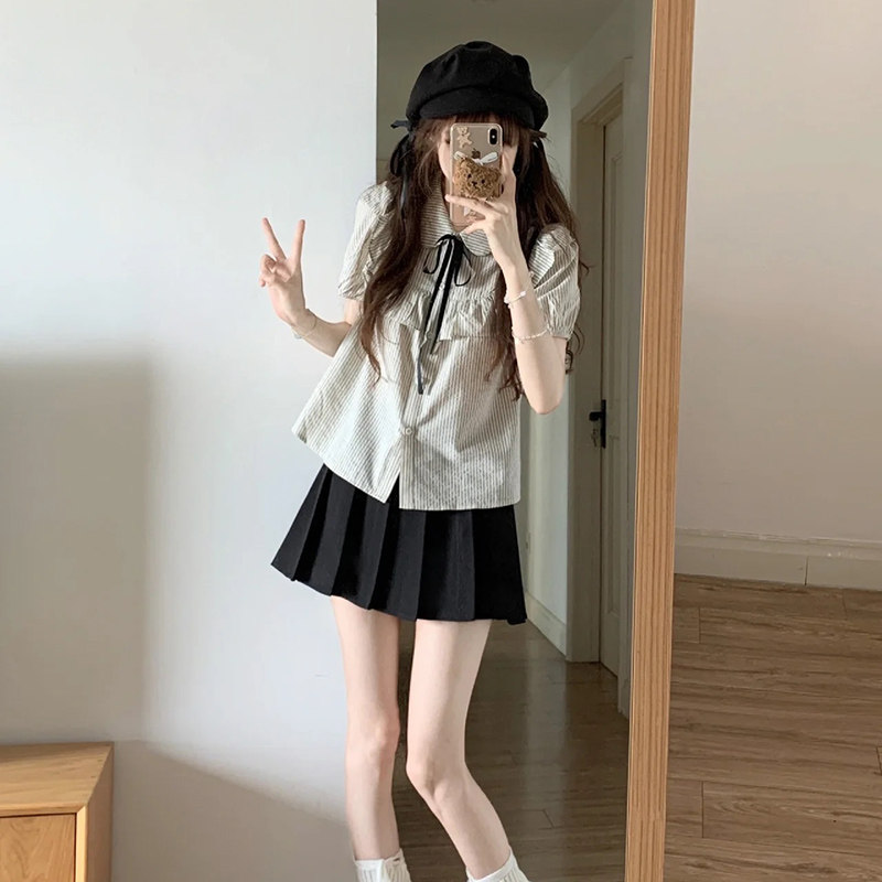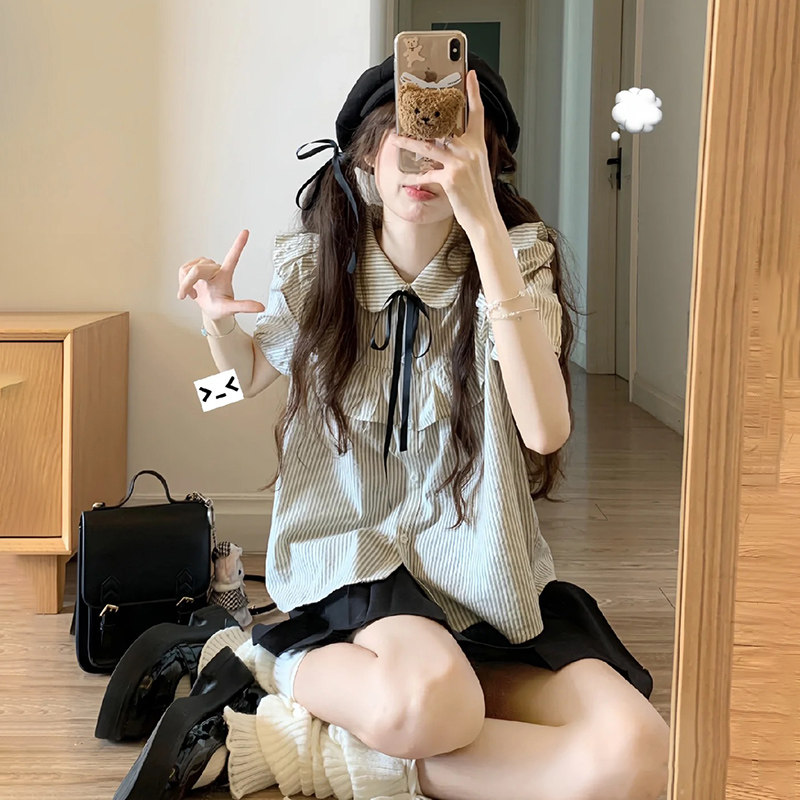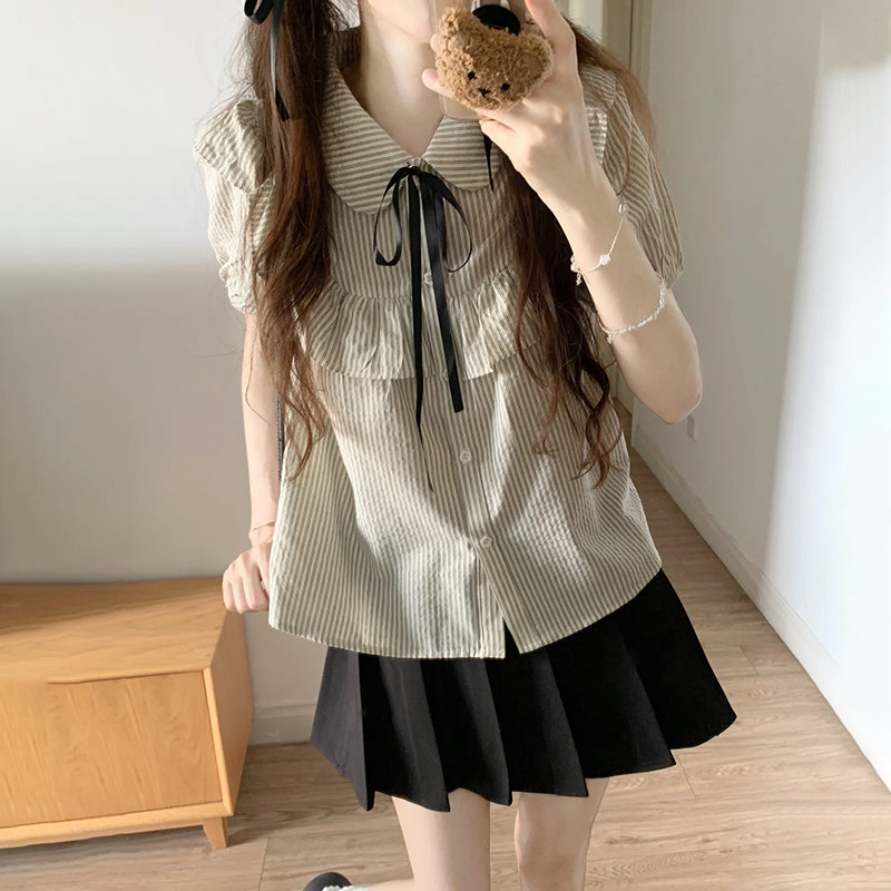 Búp bê cổ áo sơ mi ngắn tay áo nữ năm 2025 mùa hè mỏng trường học phong cách ngọt ngào French bong bóng áo sơ mi tay áo
