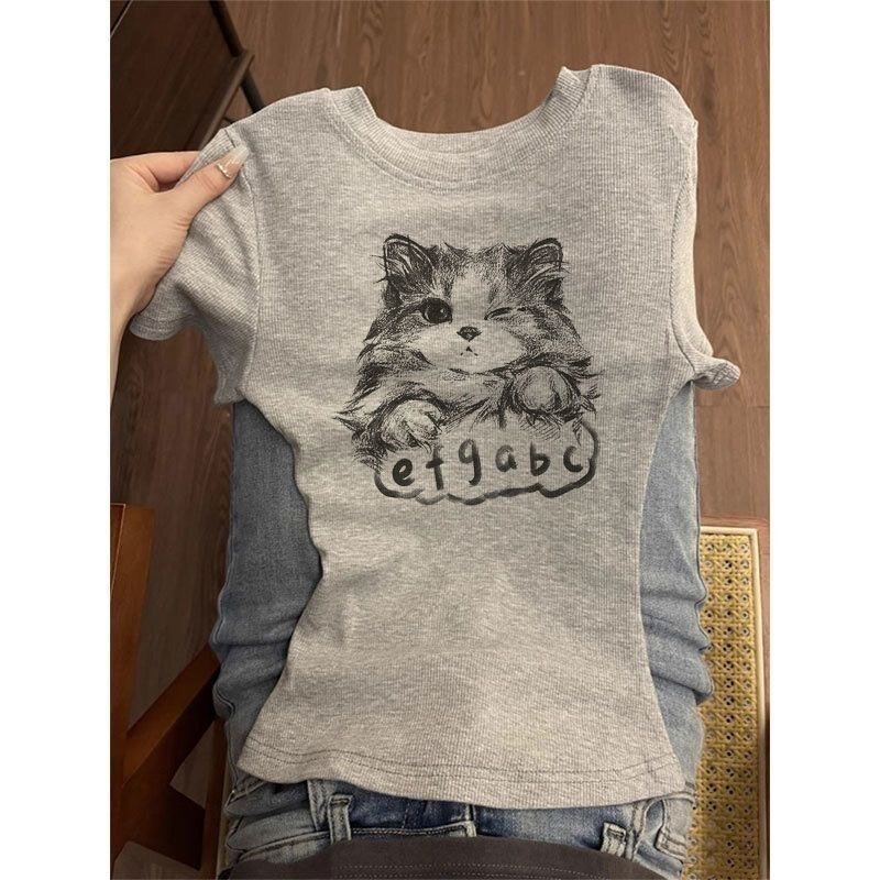 Người mỹ retro màu xám cổ cổ cổ cổ cổ cổ cổ cổ cổ áo thun ngắn tay áo mùa hè mới ngọt ngào hot girl phong cách slim top người phụ nữ