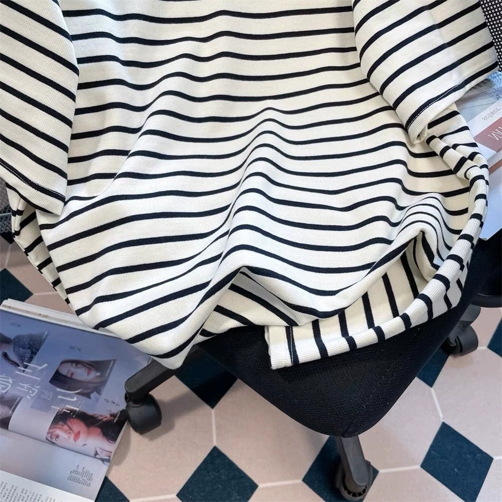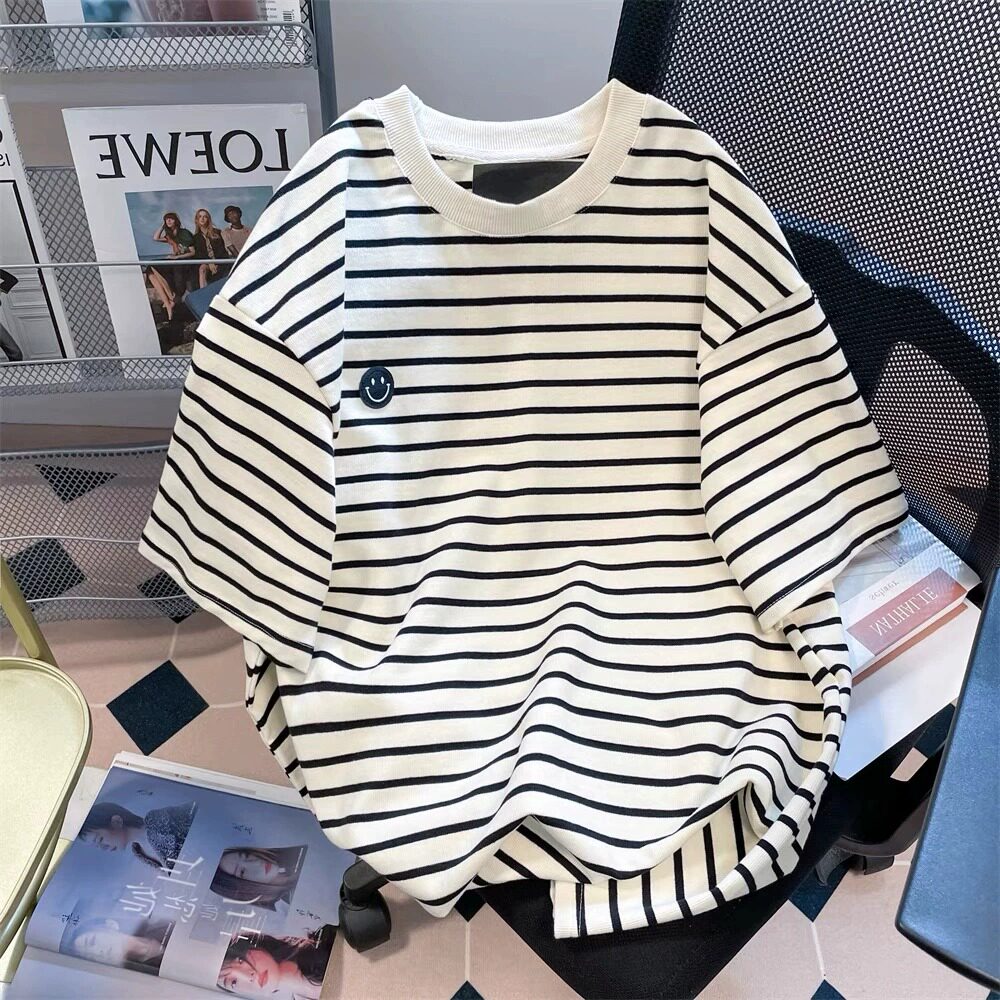 Mùa hè lớn kích thước nhỏ thêu khuôn mặt cười một nửa áo sơ mi áo sơ mi ngắn tay áo vằn của người phụ nữ