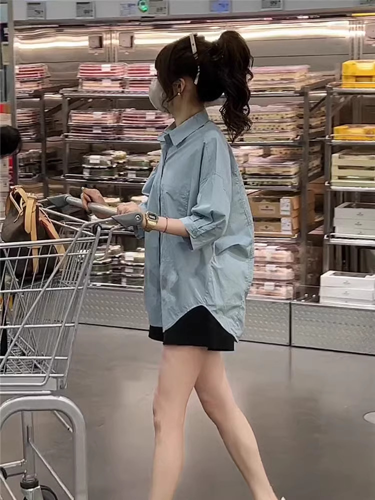 2025 người phụ nữ áo sơ mi ngắn tay áo năm tay áo sơ mi nhỏ mỏng da thịt áo sơ mi nổ phụ nữ nửa tay trắng