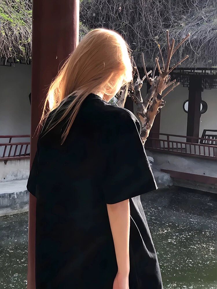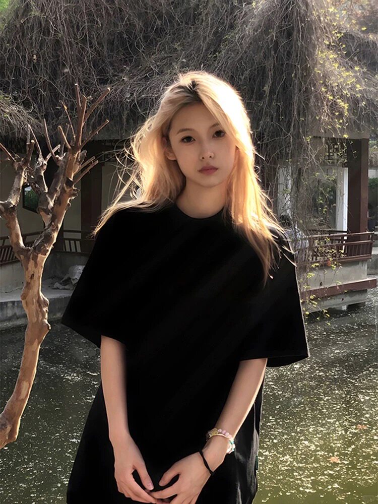 100% cotton mùa hè màu đen phong cách Mỹ cổ điển vai ngắn tay áo t-shirt nữ 100% cotton hiển thị trắng lỏng lẻo vòng cổ áo đầu ins