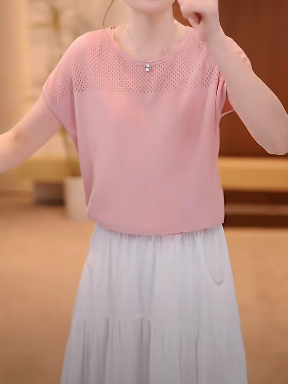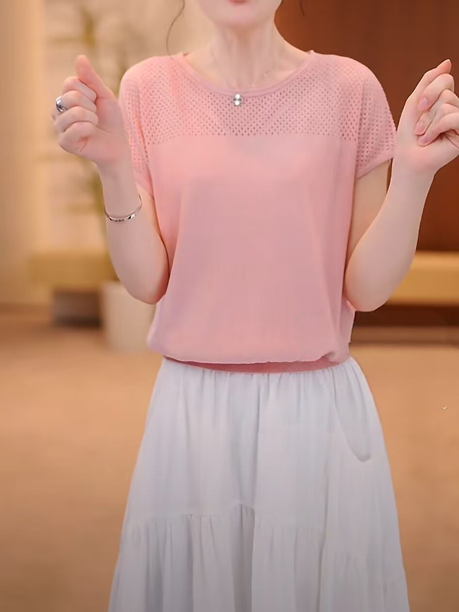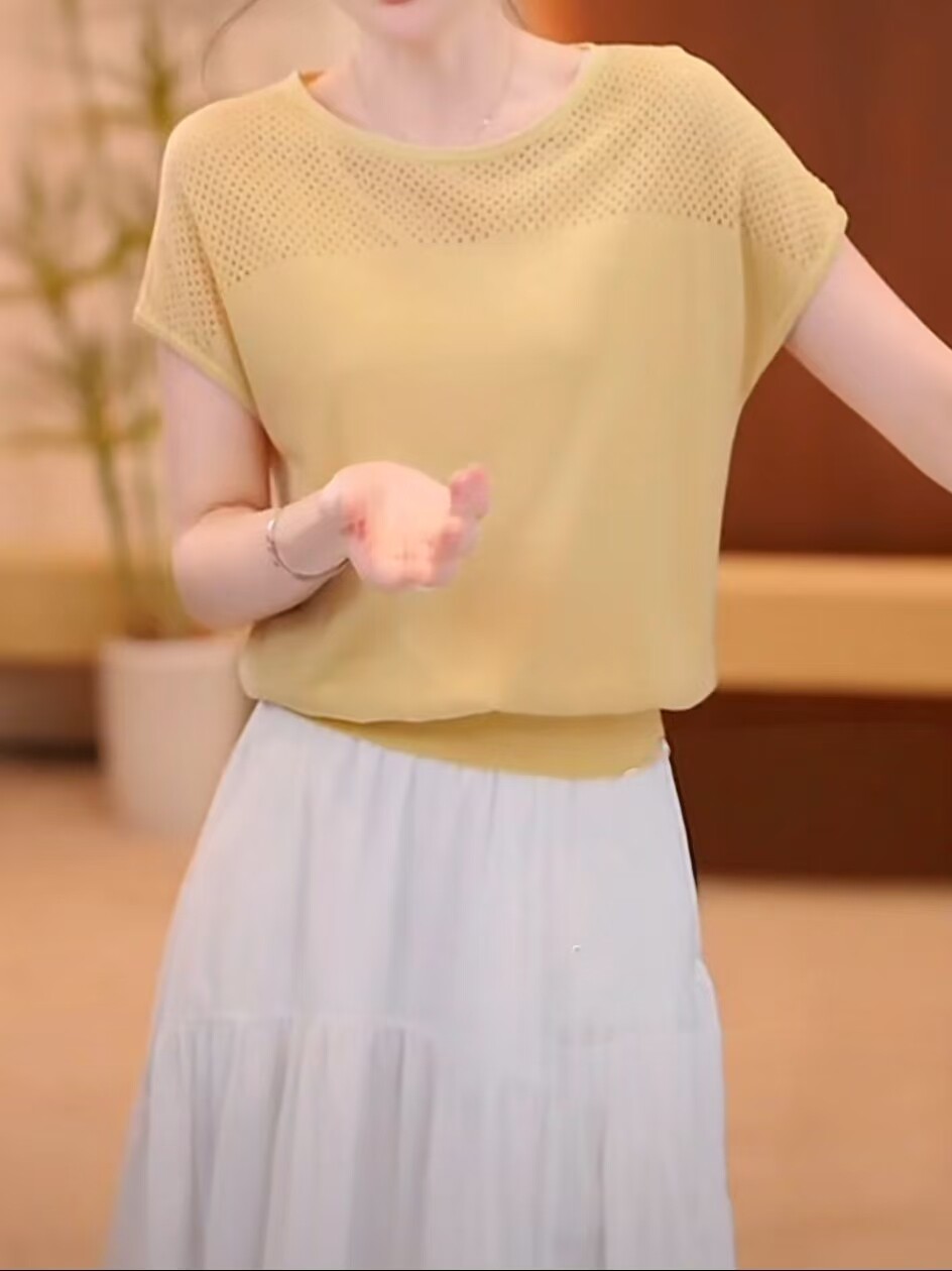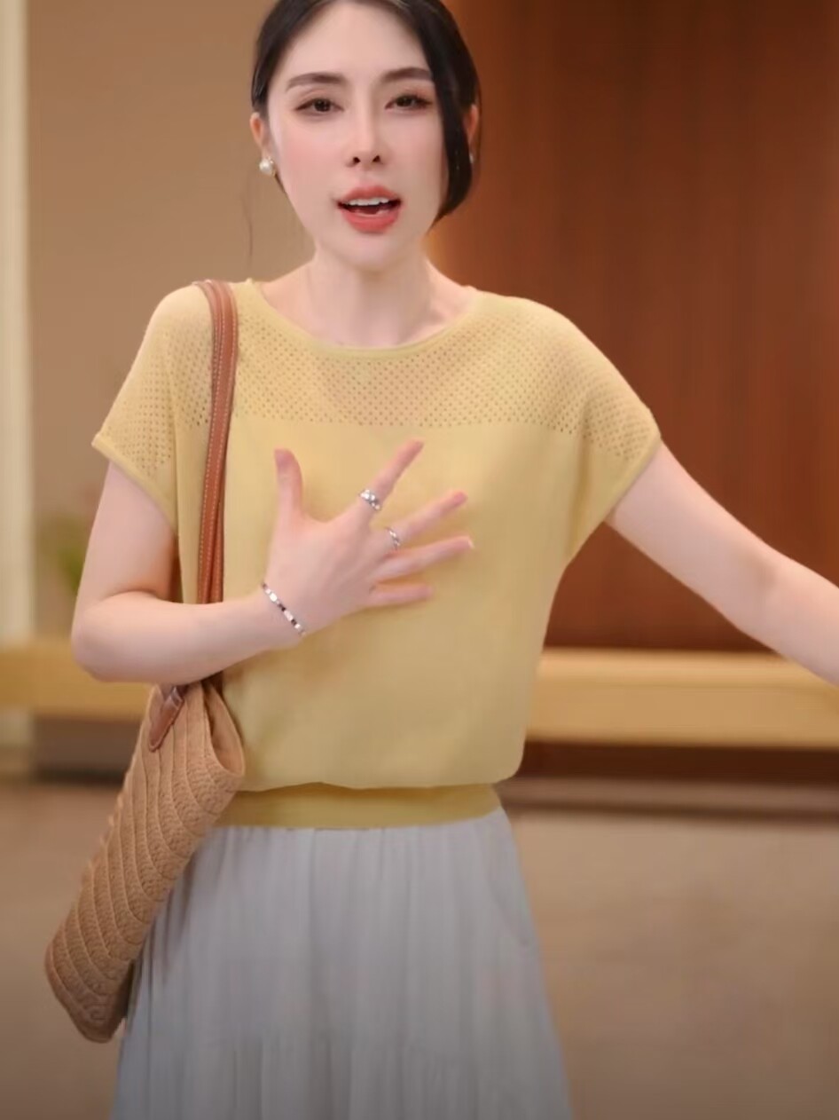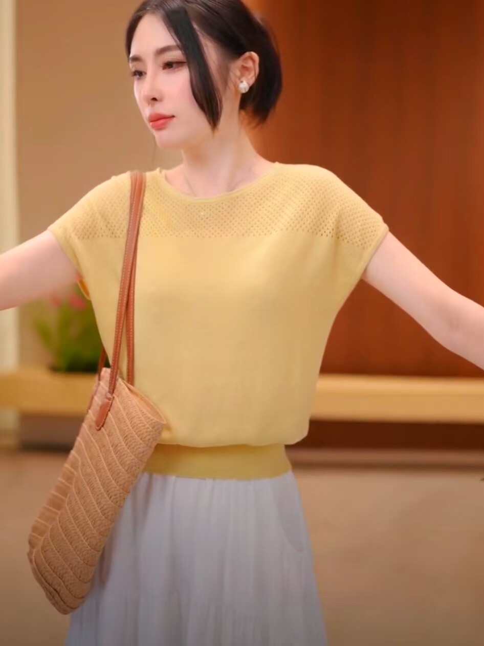 Tensin mỏng stench knitted tay áo ngắn mùa hè năm 2025 người phụ nữ mới vòng cổ băng áo sơ mi lỏng thong