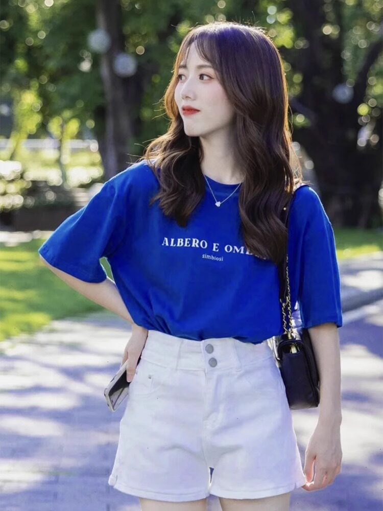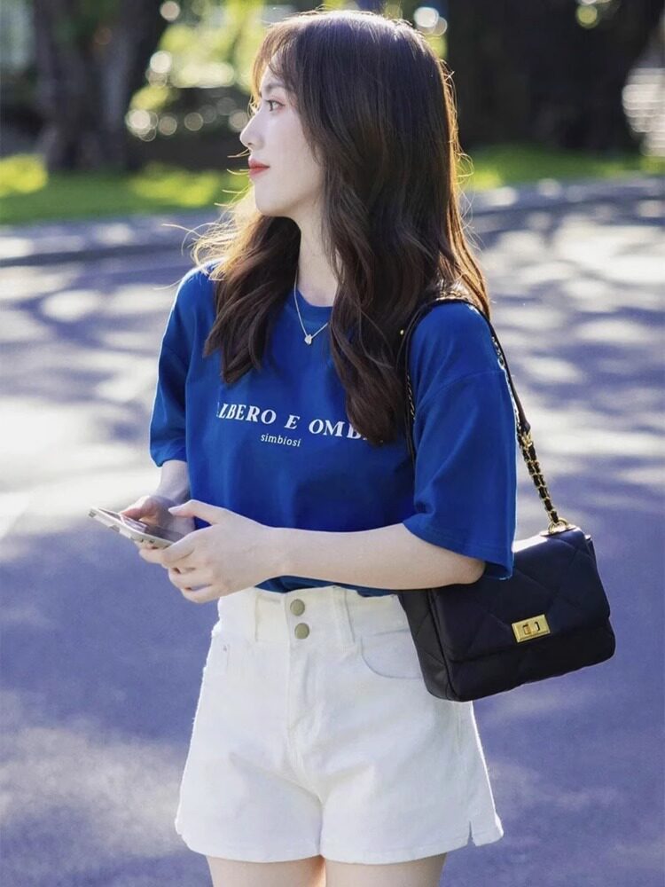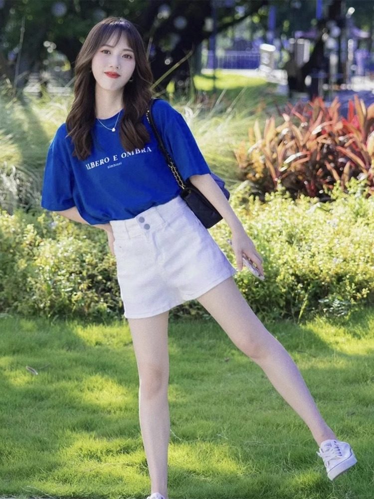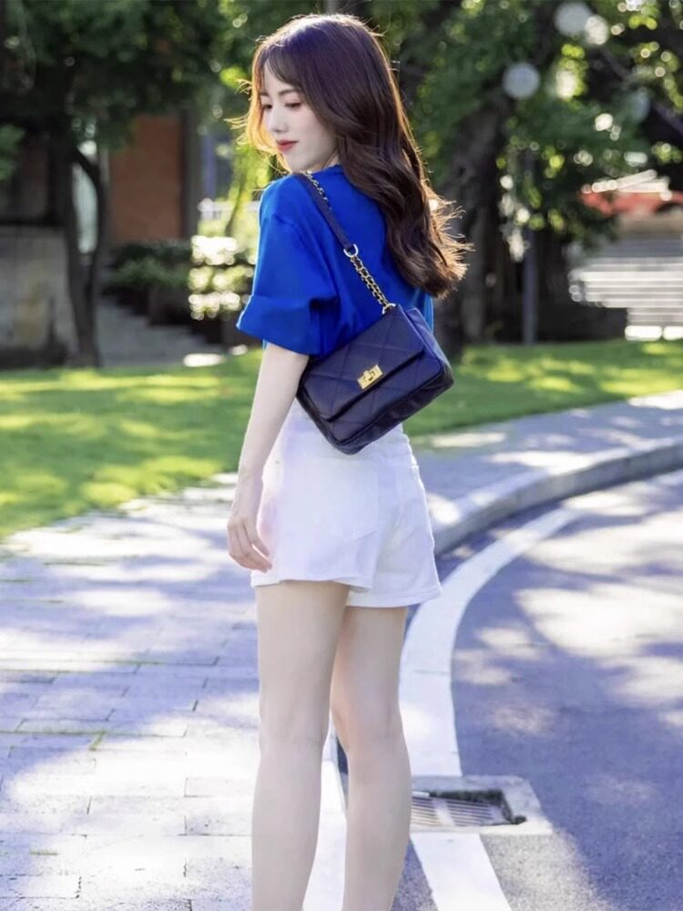 Mùa hè năm 2025 trà mới với một bộ áo sơ mi xanh tay áo ngắn quần short hai mảnh của nữ klein