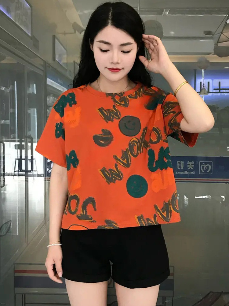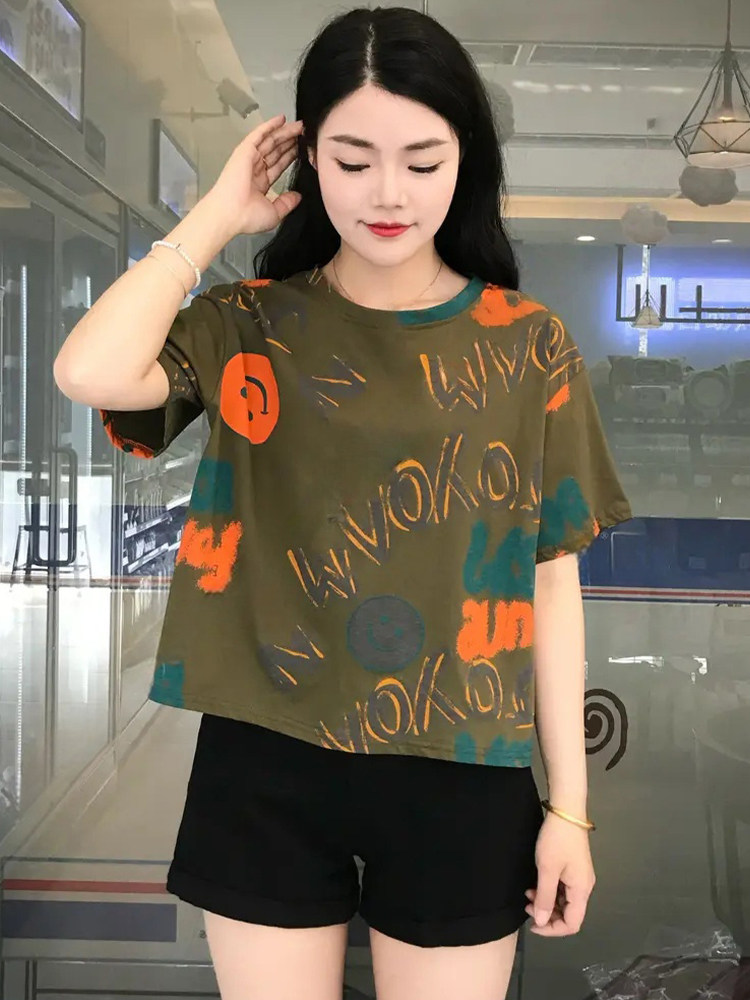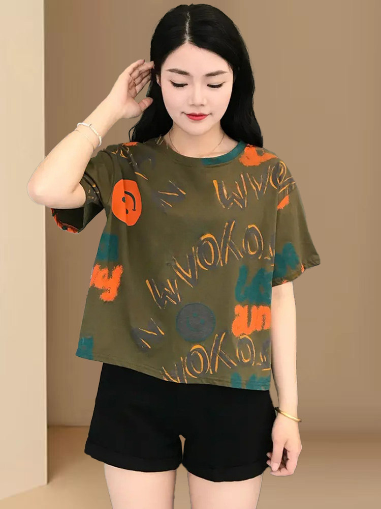 Bông nhỏ tay áo ngắn tay áo thun cho phụ nữ 2025 mùa hè mới che thịt hiển thị gầy thiết kế cảm giác giản dị 䕑 vòng cổ áo