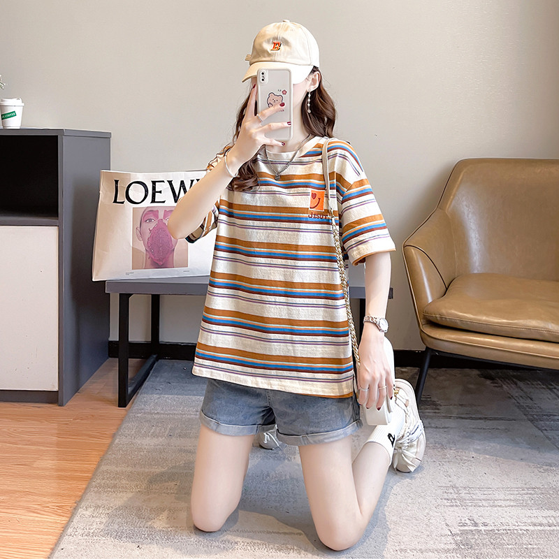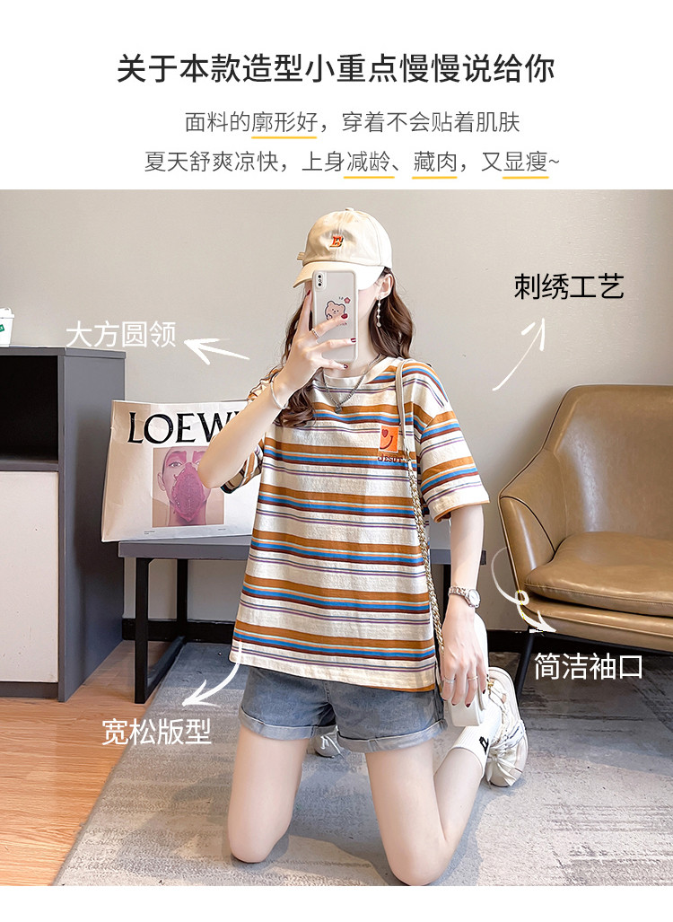 Kích thước lớn của phụ nữ mùa hè mới đến châu Âu hàng hóa phiên bản lớn đầy màu sắc sọc ngắn tay áo T-shirt cho phụ nữ lỏng lẻo thêu bông nguyên chất hàng đầu ẩm ướt