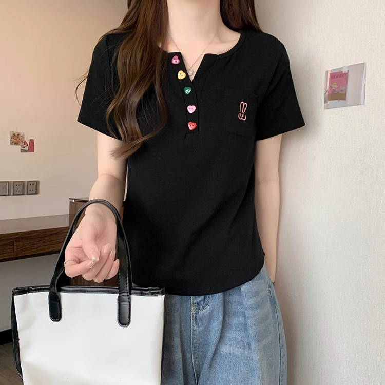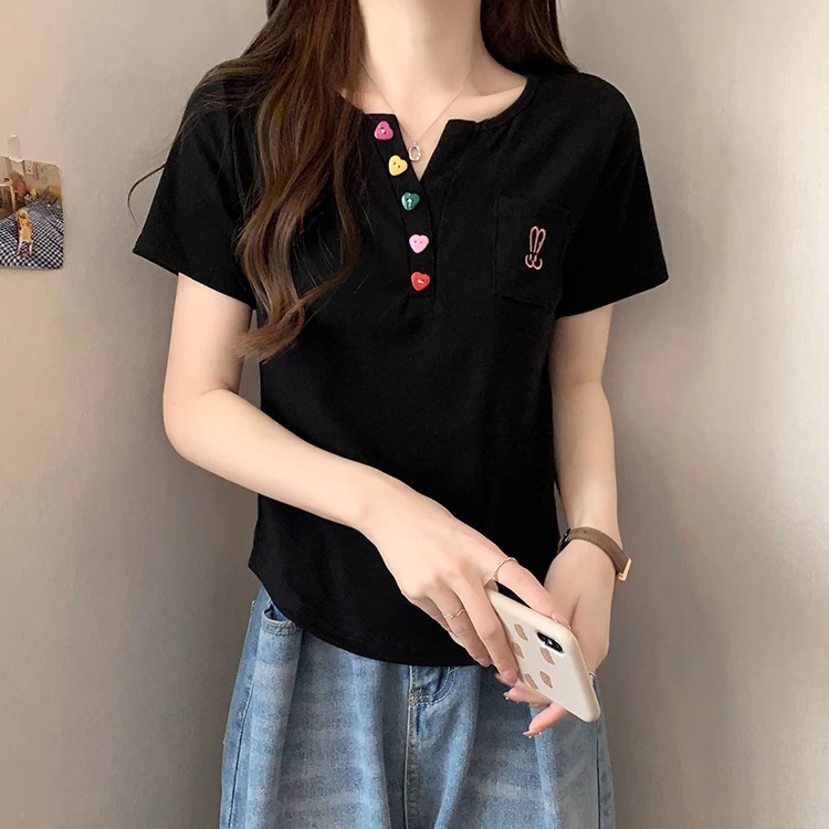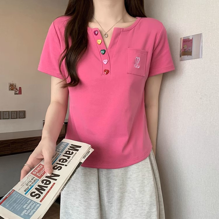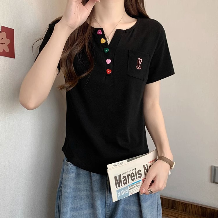 Áo thun áo ngắn tay vai của phụ nữ mùa hè năm 2025 mới chất béo mm lỏng lẻo giảm độ tuổi để che bụng cổ áo