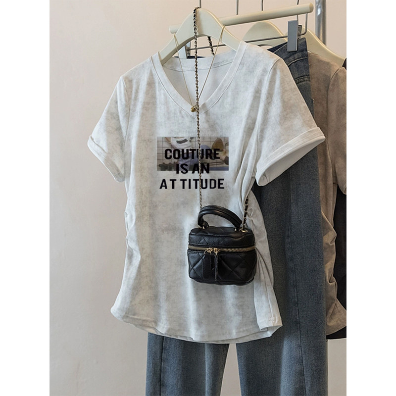 Tie nhuộm cổ v cổ áo ngắn tay áo T-shirt mùa hè năm 2025 người phụ nữ mới quy mô lớn, mũm mĩm nếp gấp được thiết kế rộng eo áo sơ mi