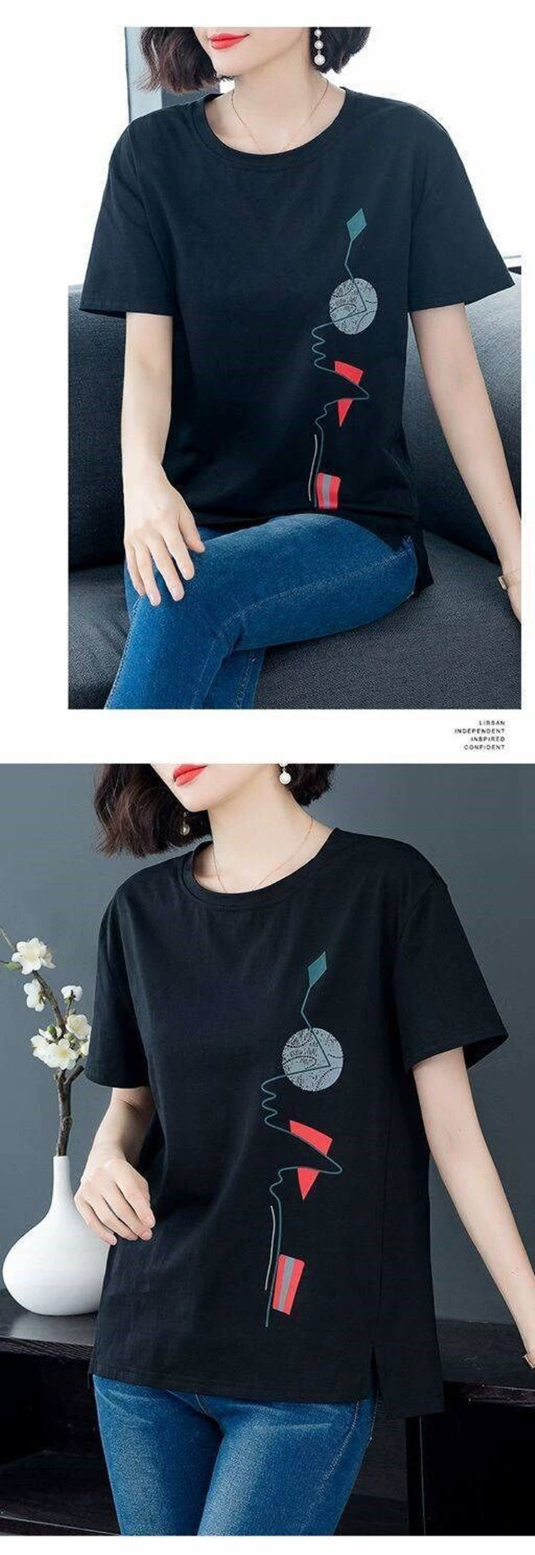 Áo thun ngắn tay cho phụ nữ Hàn Quốc lỏng lẻo cộng với kích thước nửa tay áo giản dị 2025 mới màu in đáy