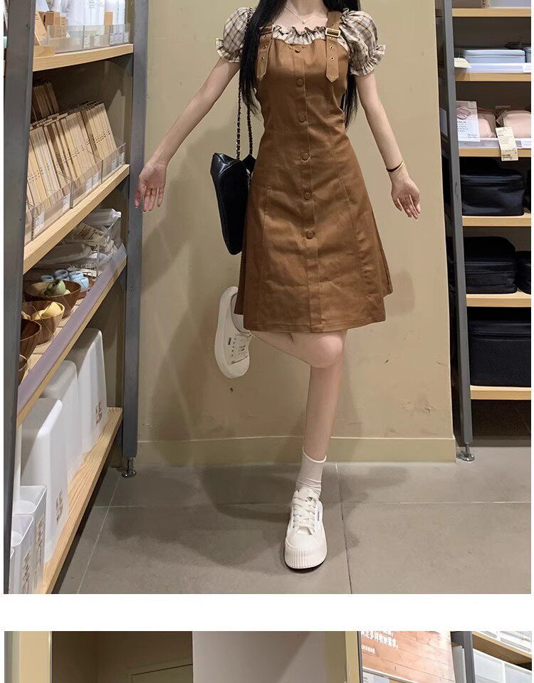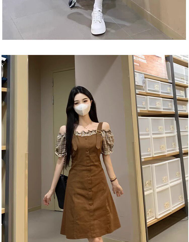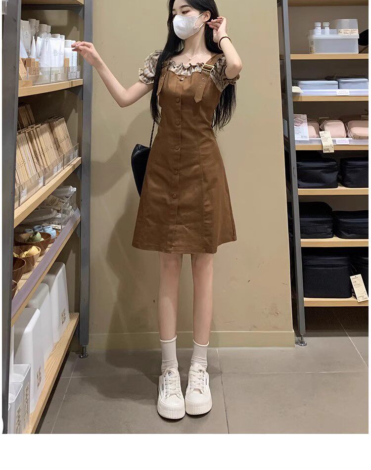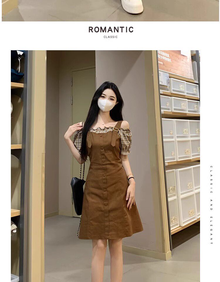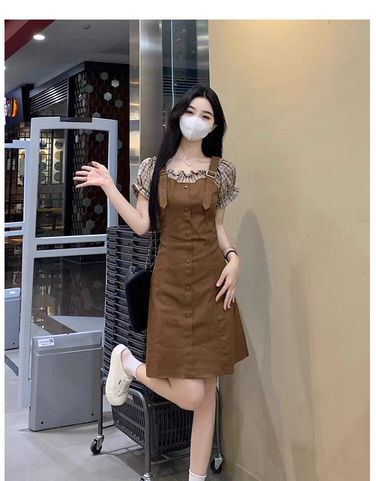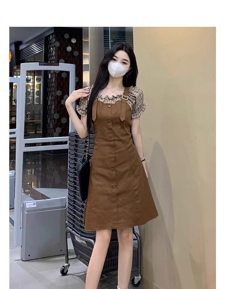 Thêm kích thước quần áo ngắn tay áo mùa hè patchwork sai hai bộ váy nhỏ chất béo mili-mét cổ eo váy duyên dáng