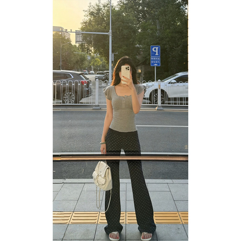 Áo thun cotton cổ chữ U cổ chữ U, cô gái nóng bỏng, eo cao, gầy, áo ngắn tay.