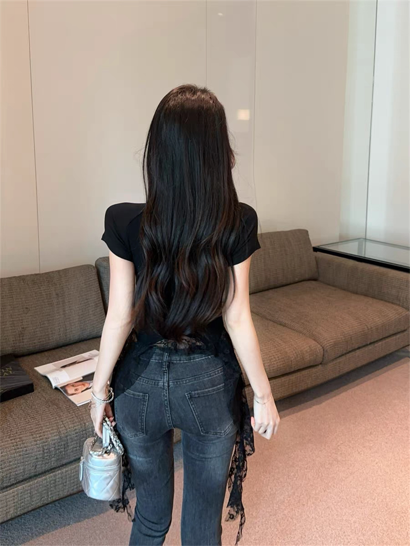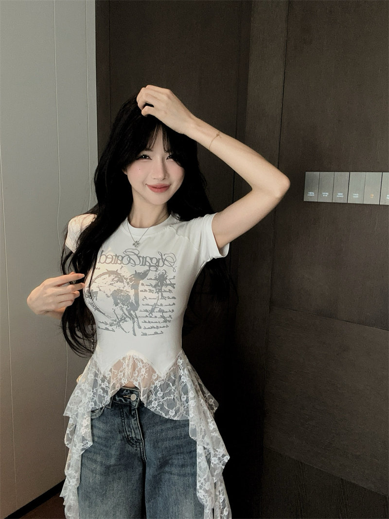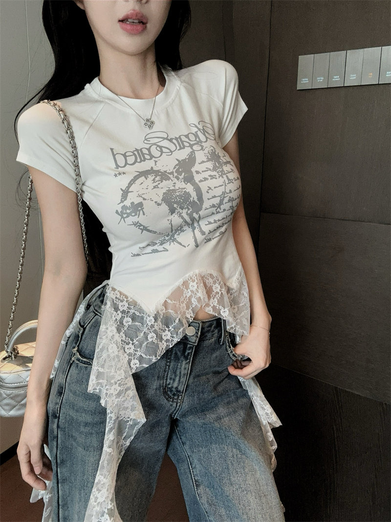 American sweet girl tuyệt đẹp áo thun ren vòng tay ngắn mùa hè phụ nữ in ấn và thiết kế áo khoác không đối xứng