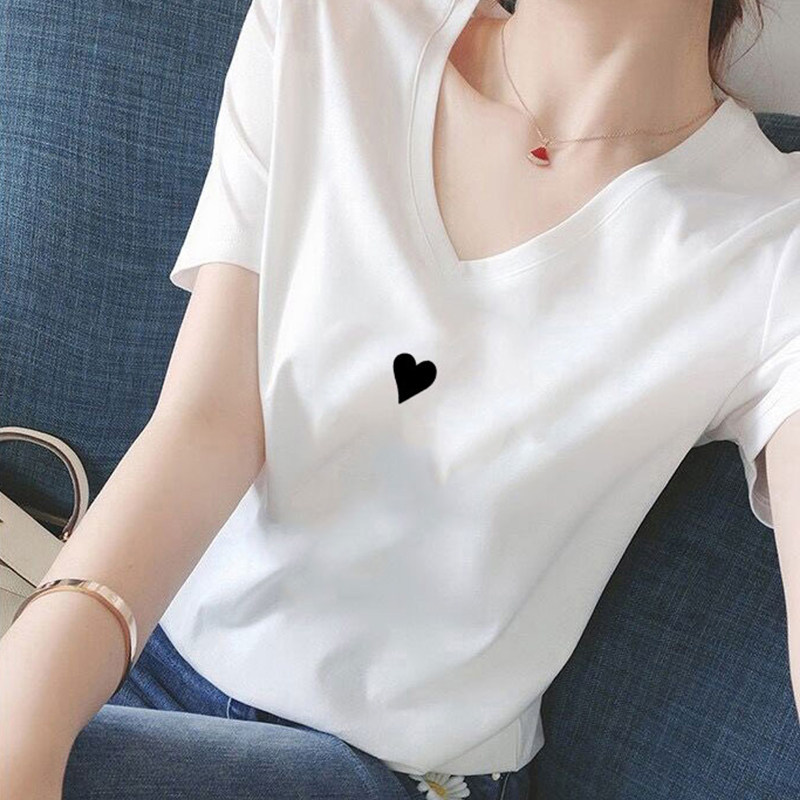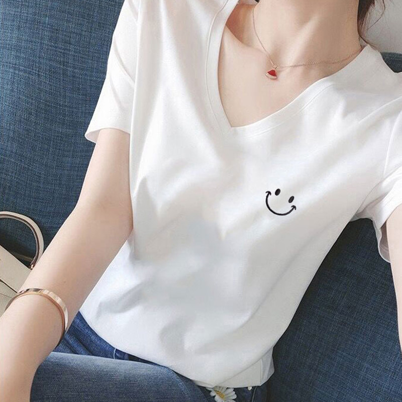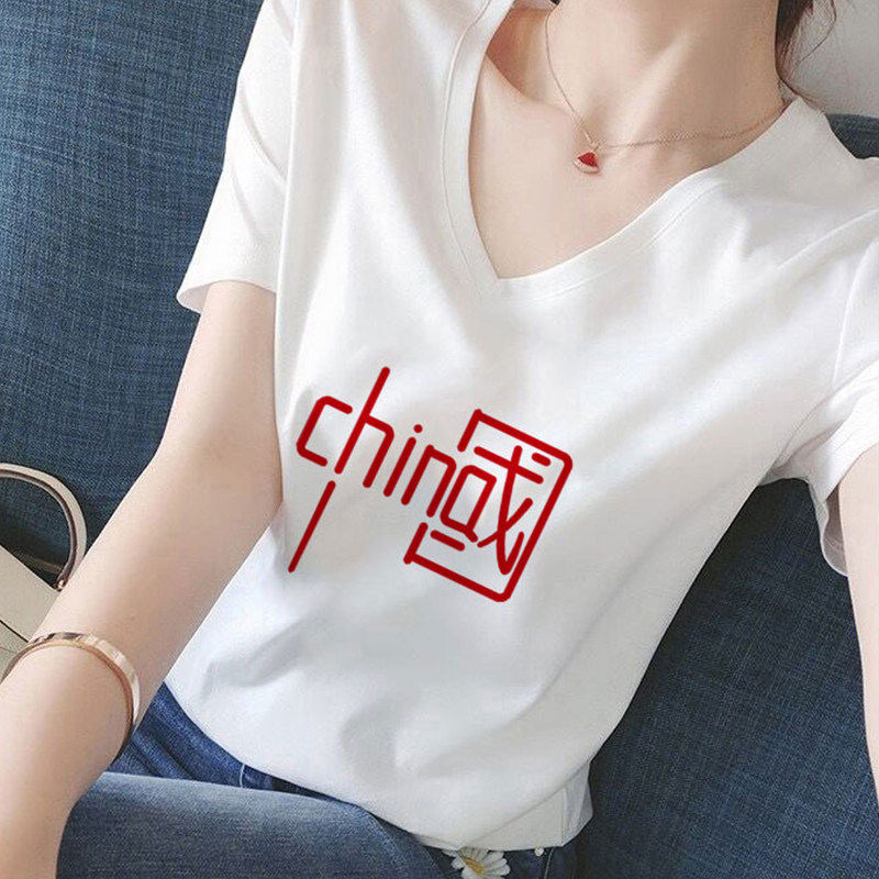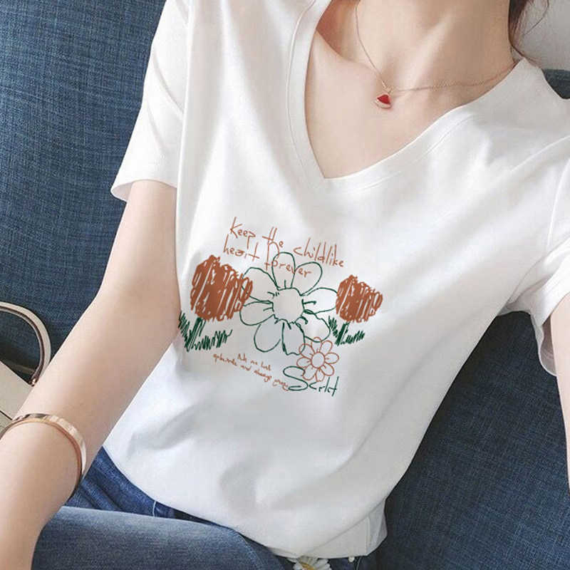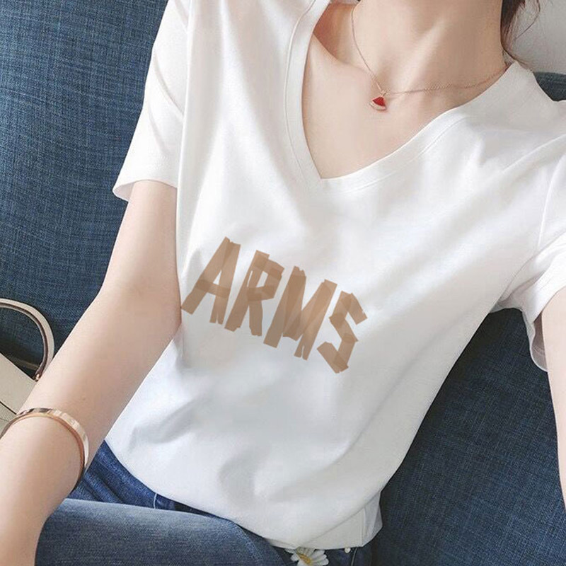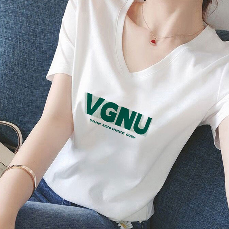 2024 mùa hè ngắn gọn mỏng trắng áo sơ mi áo sơ mi nữ V cổ lỏng ký tự in ấn hàn quốc quần áo