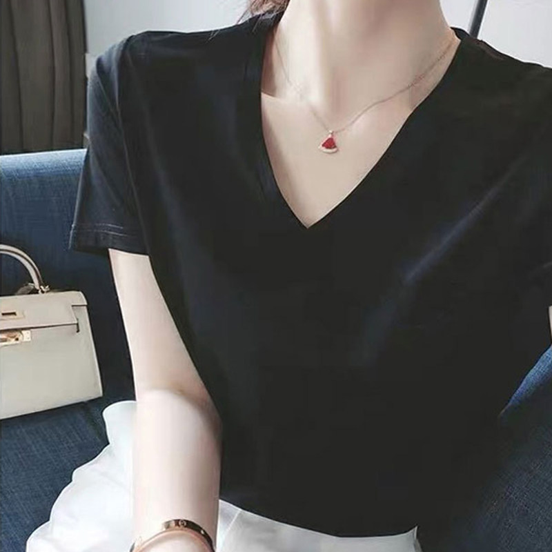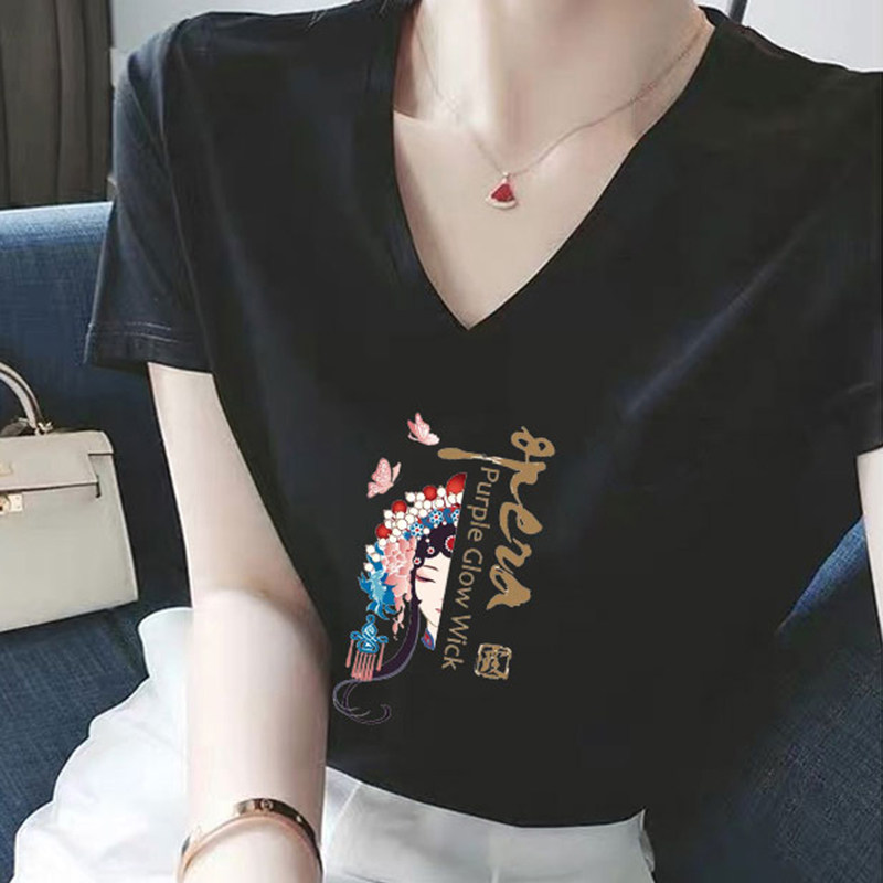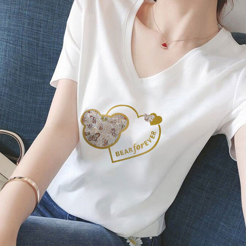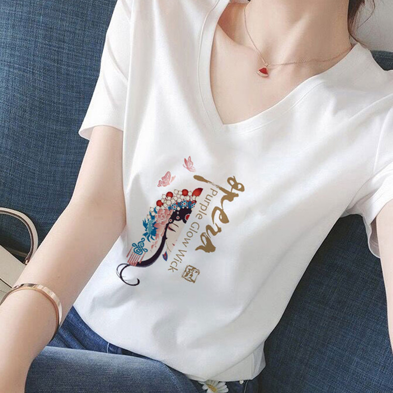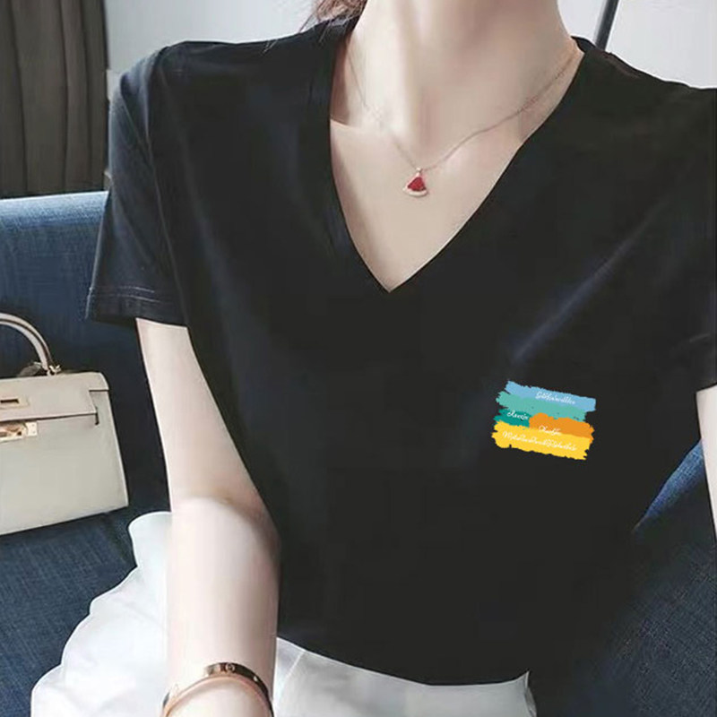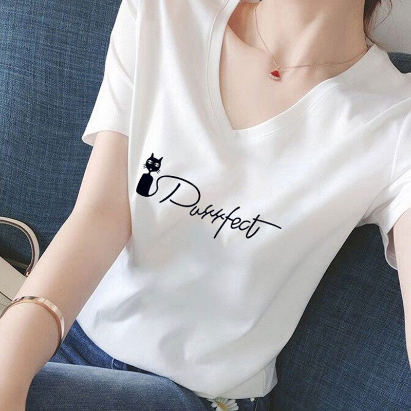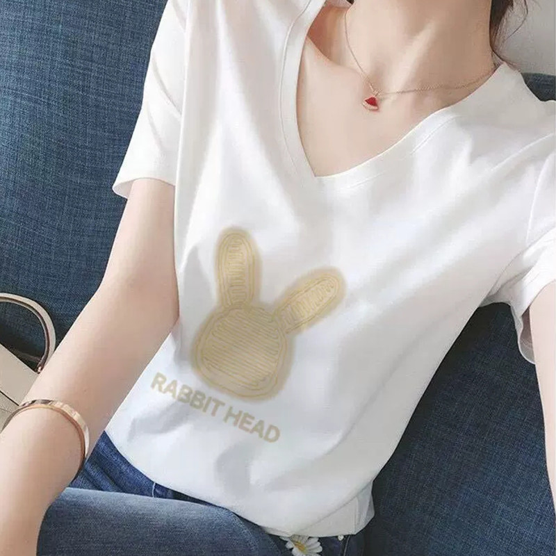 2024 mùa hè ngắn gọn mỏng trắng áo sơ mi áo sơ mi nữ V cổ lỏng ký tự in ấn hàn quốc quần áo