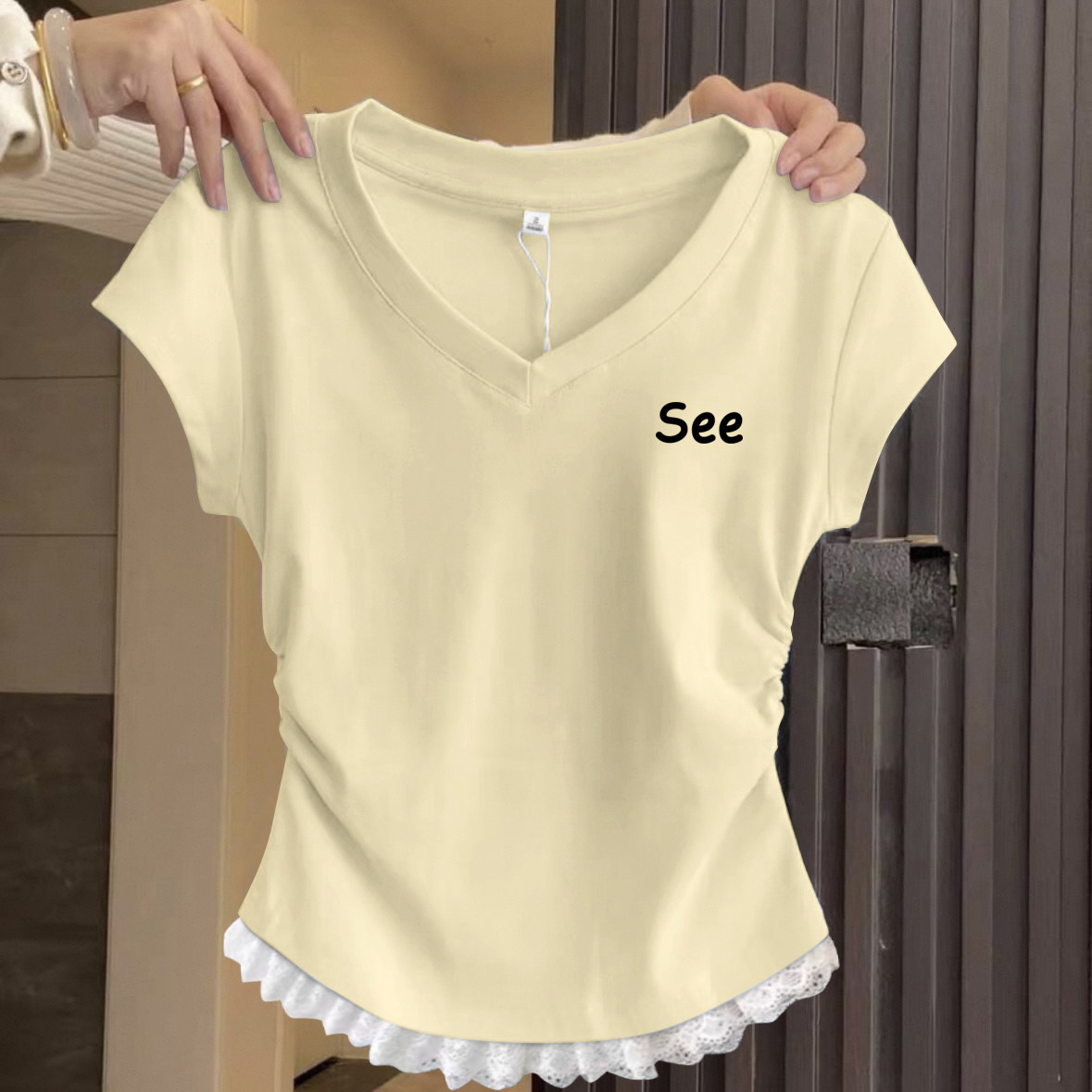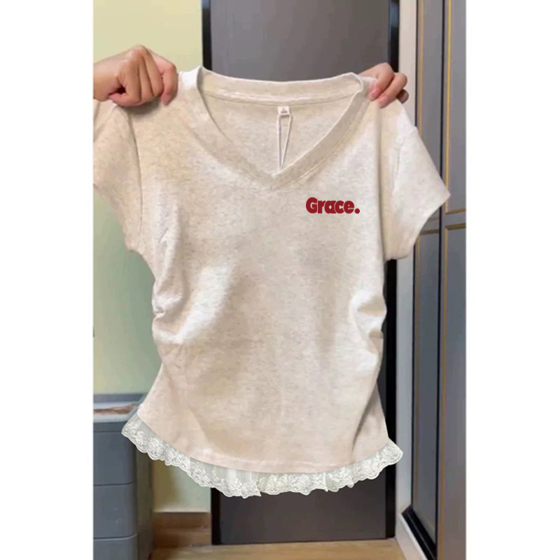Mùa hè năm 2025 mới ren ren áo sơ mi ngắn tay ngọt ngào gió gió sơ mi nhỏ V cổ áo mỏng