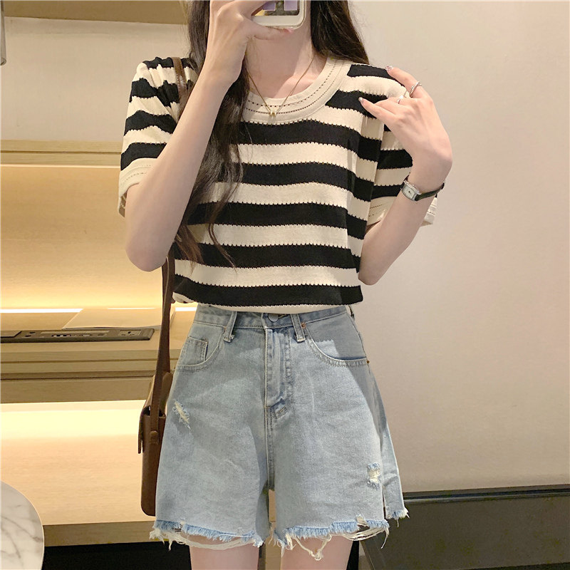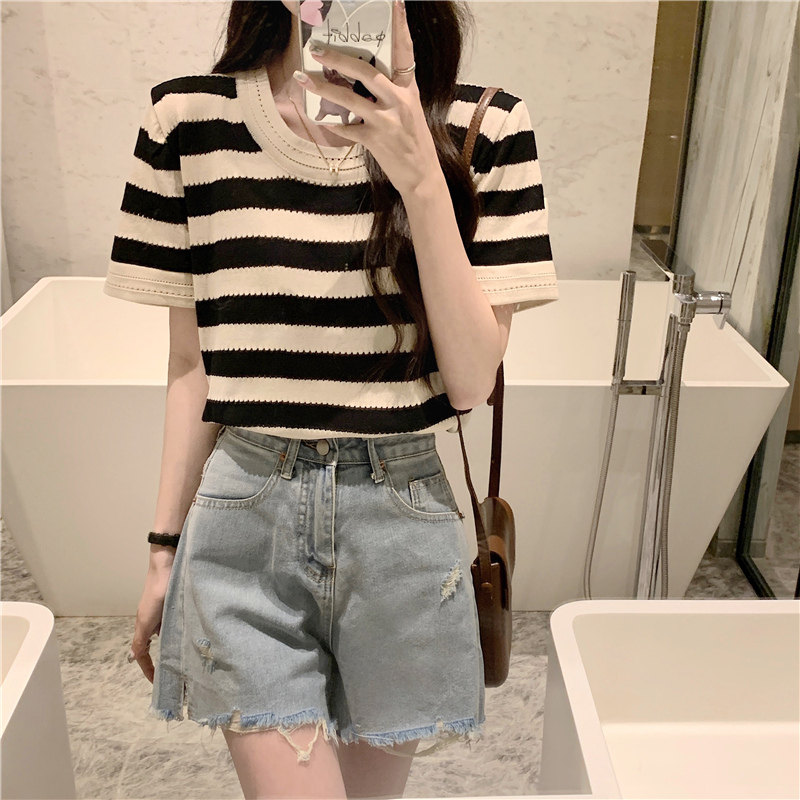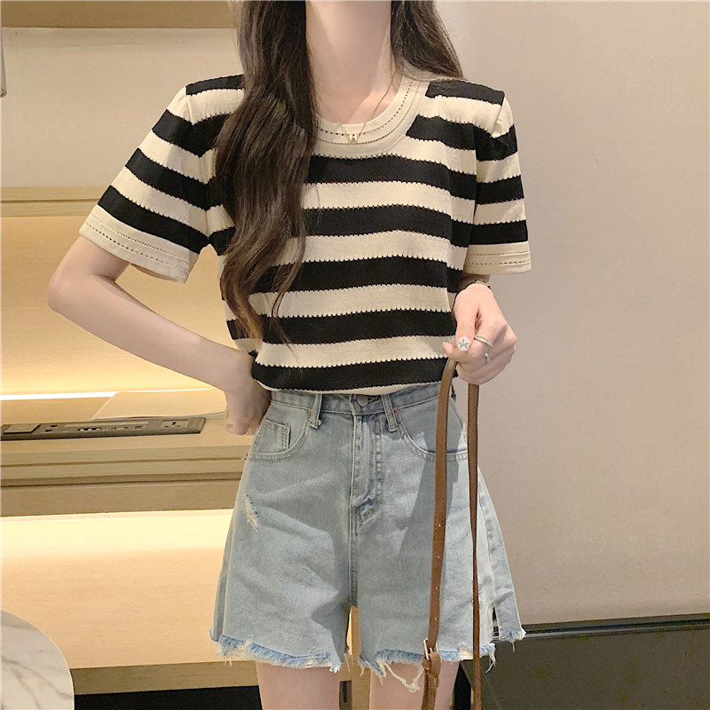 Mùa hè năm 2025 mới áo thun sọc sọc vai ngắn ngắn tay áo ngắn băng đan áo