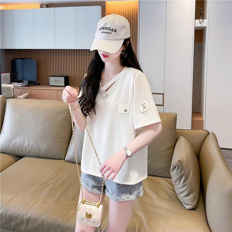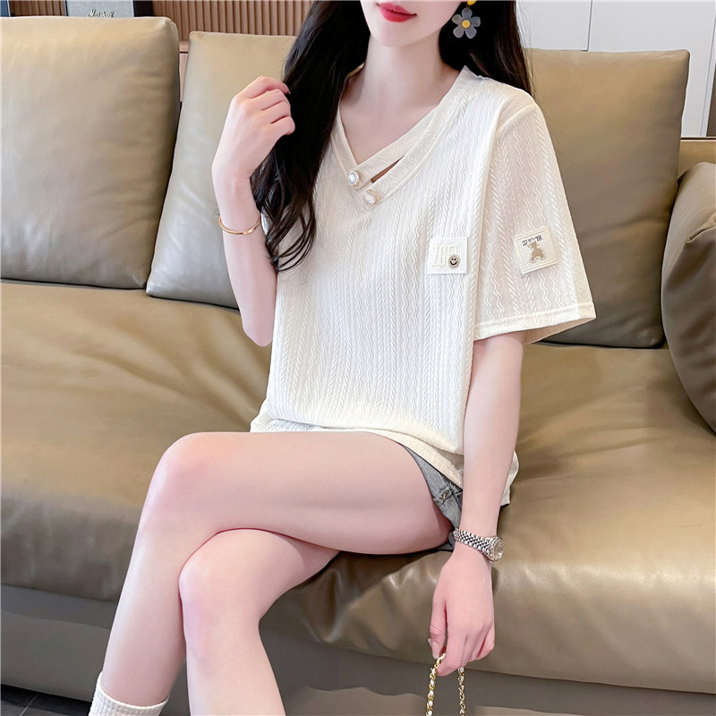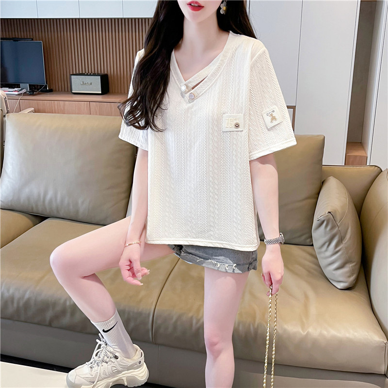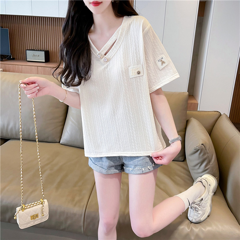 Kích thước lớn của phụ nữ thiết kế cổ chữ V cảm giác quần chúng ngắn tay áo t-shirt cho phụ nữ mùa hè 2025 phong cách mới phù hợp với quần áo ngắn