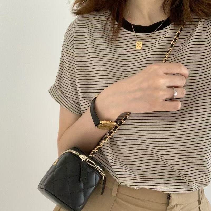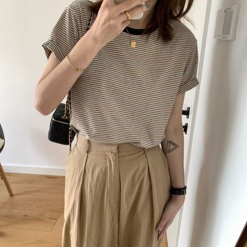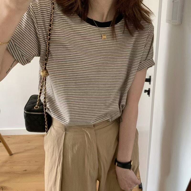 Sọc ngắn tay t-shirt in cho phụ nữ mùa hè 2025 mới phổ quát Mỹ thời trang Slim Look Casual Style Top