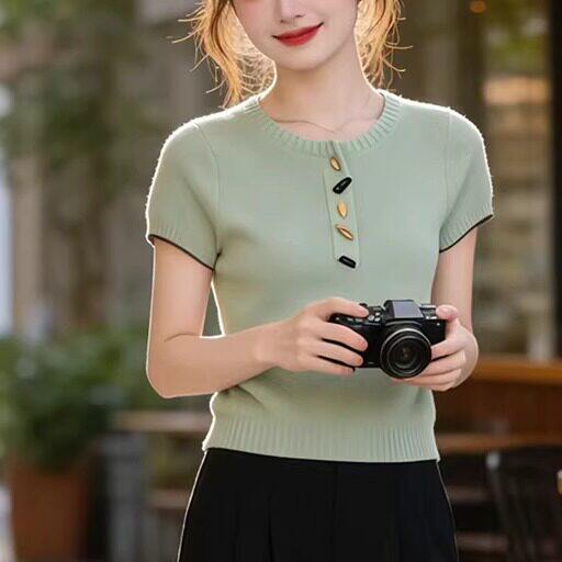 2026 mùa hè mới màu xanh lá cây vòng cổ áo ngắn tay áo thun thiết kế nút áo may mặc giảm độ tuổi áo khoác mỏng