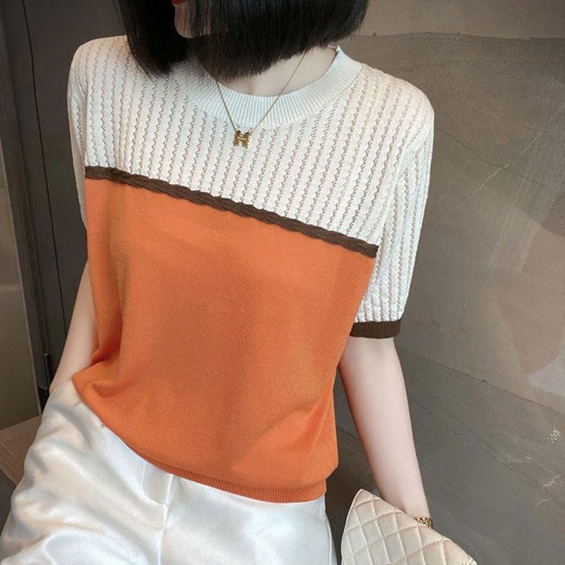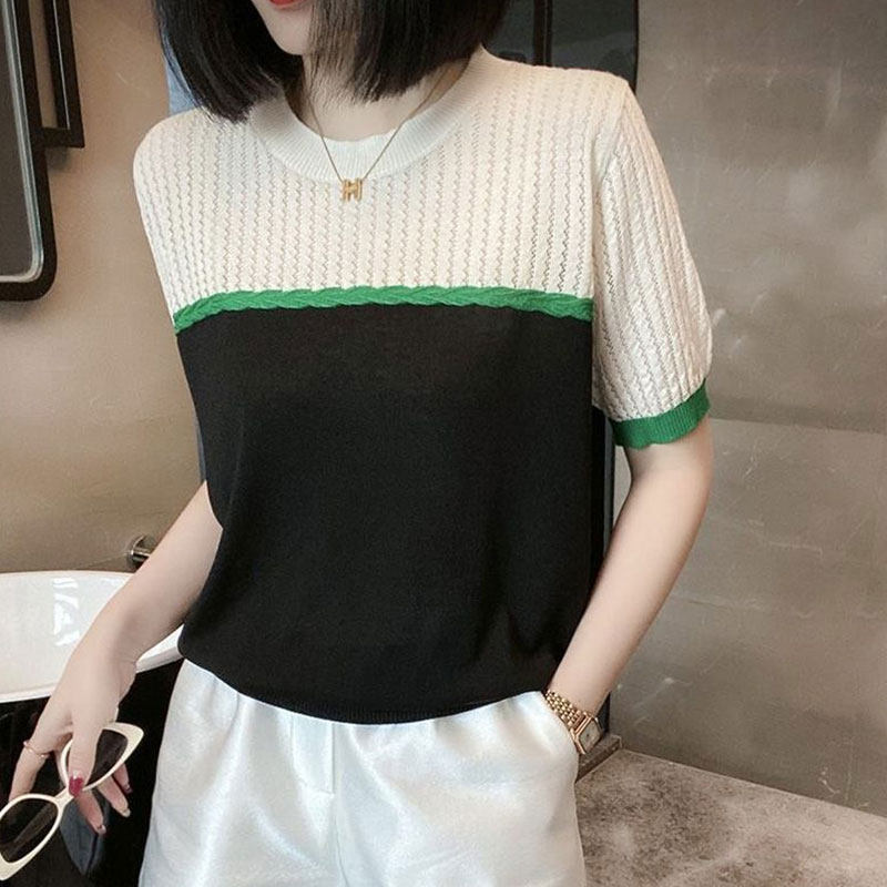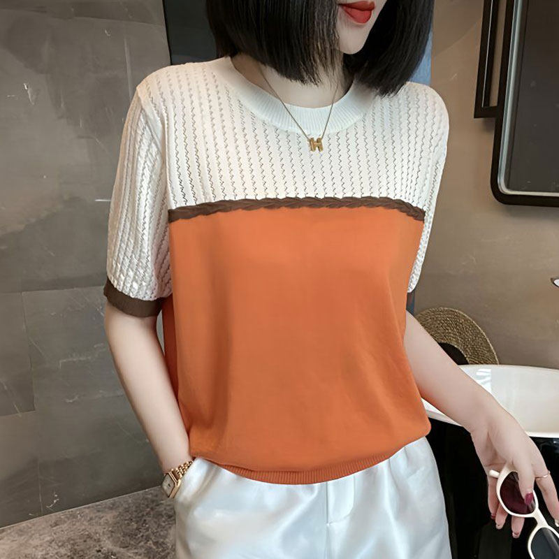 2025 Mùa hè mới cắt màu ngắn tay băng lụa dệt kim T-shirt thời trang giản dị cho phụ nữ
