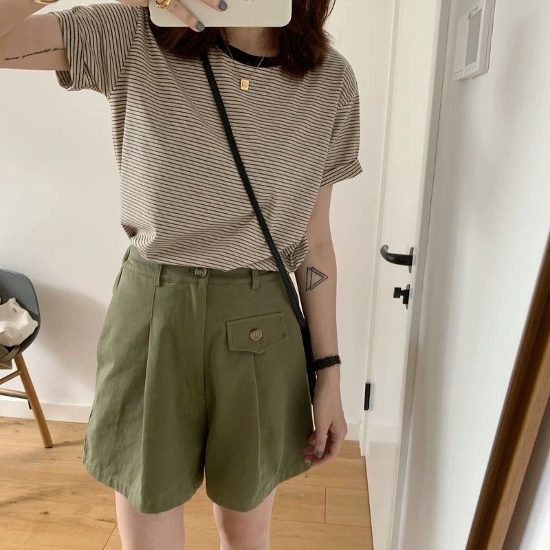 Năm 2025 người phụ nữ mặc áo thun áo sơ mi sọc ngắn tay áo mùa hè thiết kế áo sơ mi ngắn tay