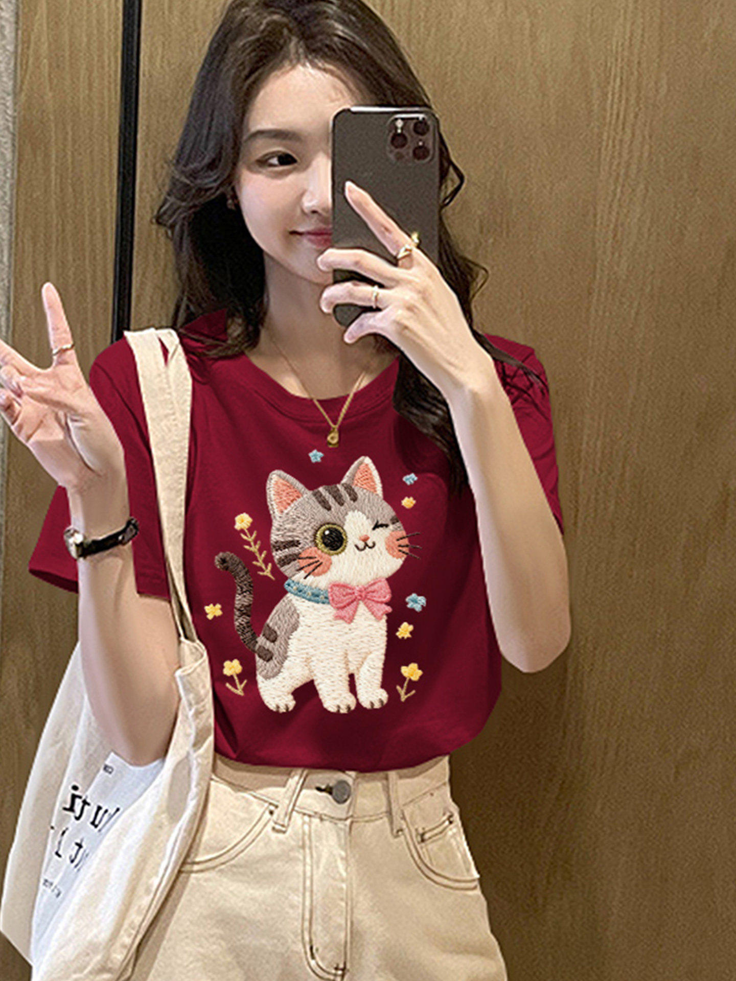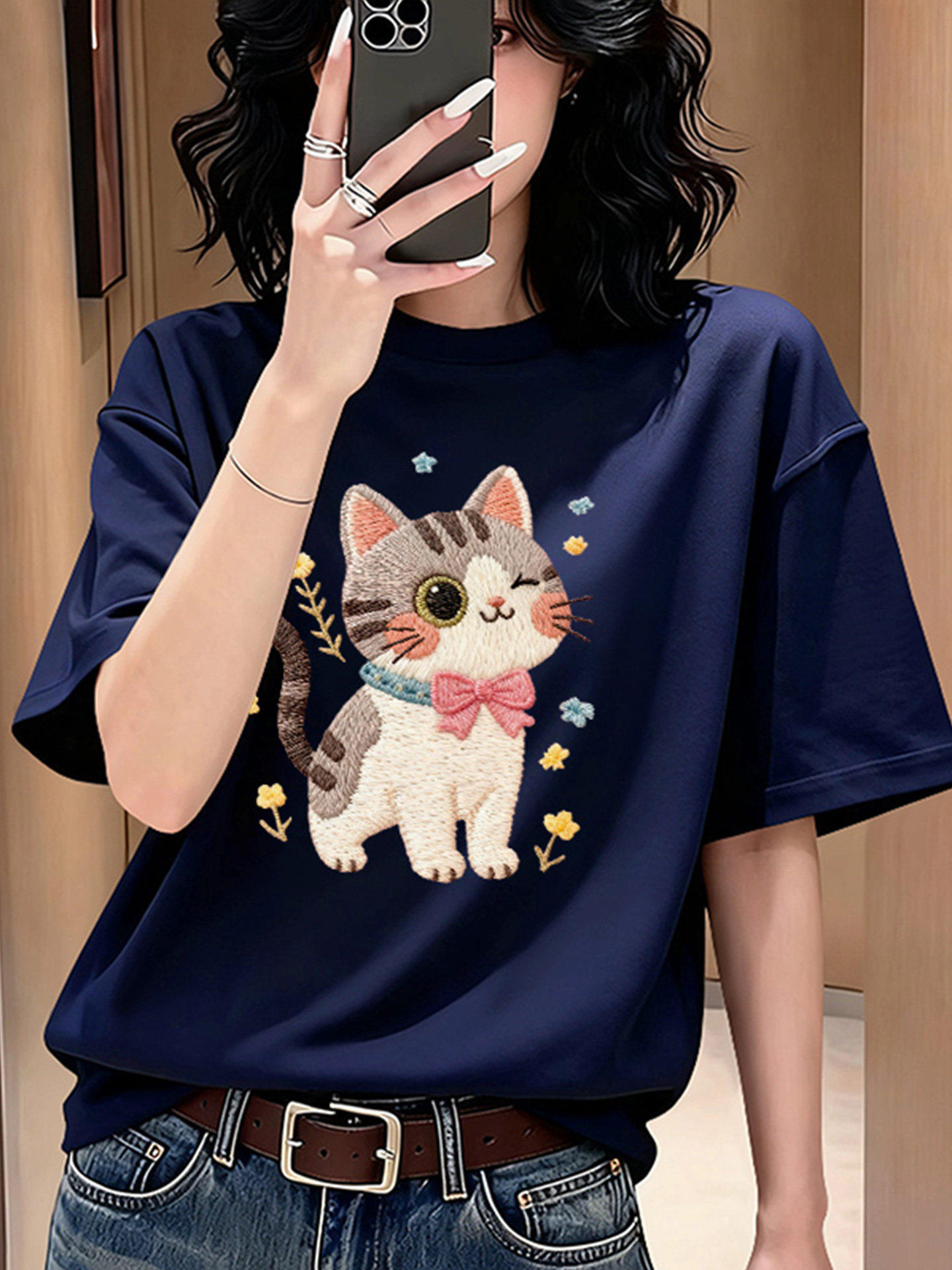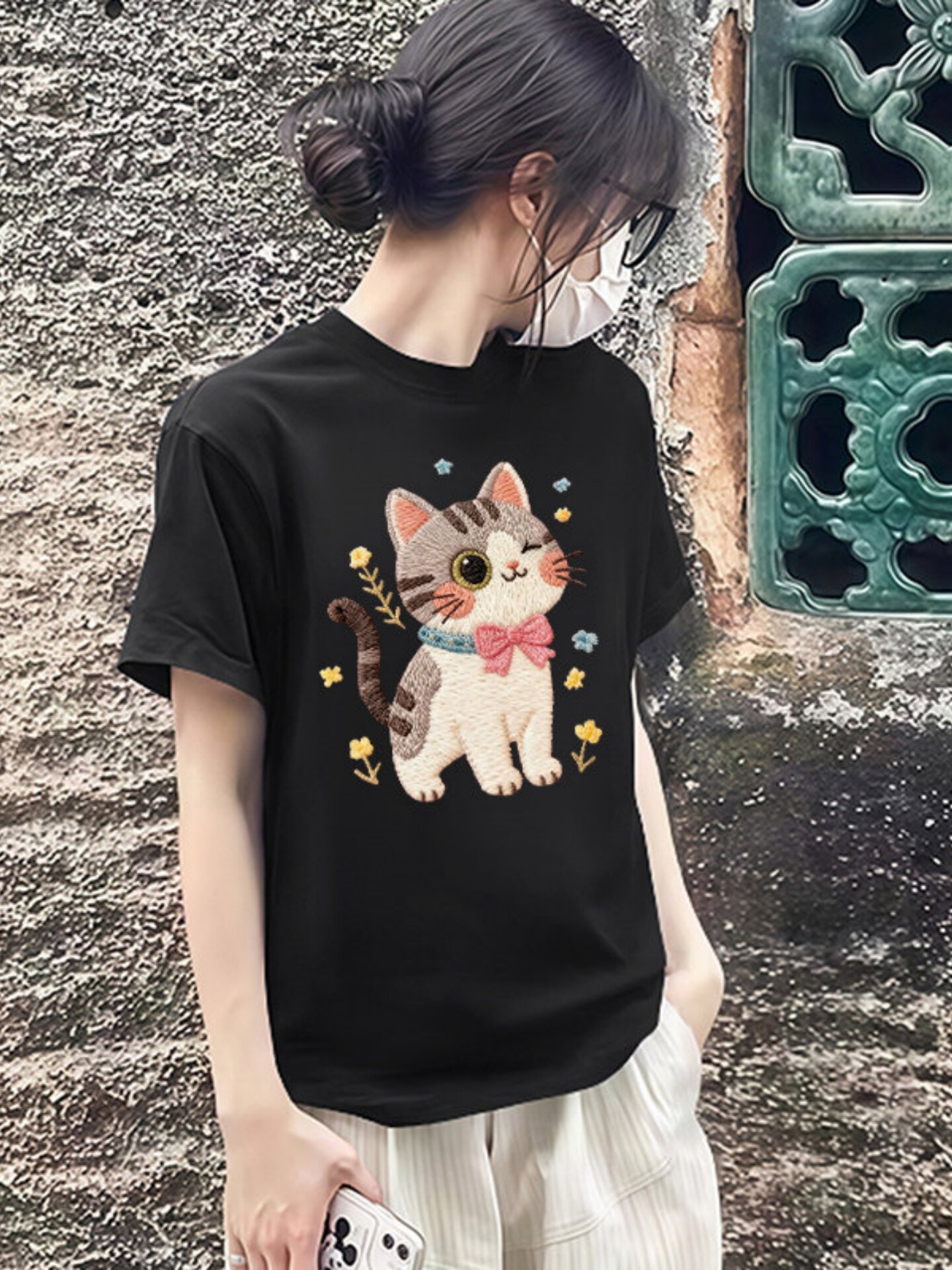 Han hệ dễ thương "in" con mèo con cái áo thun cộc tay nữ 2026 bằng màu trắng mùa hè mới ChunMian thư giãn bê-rít-sin áo thô ins