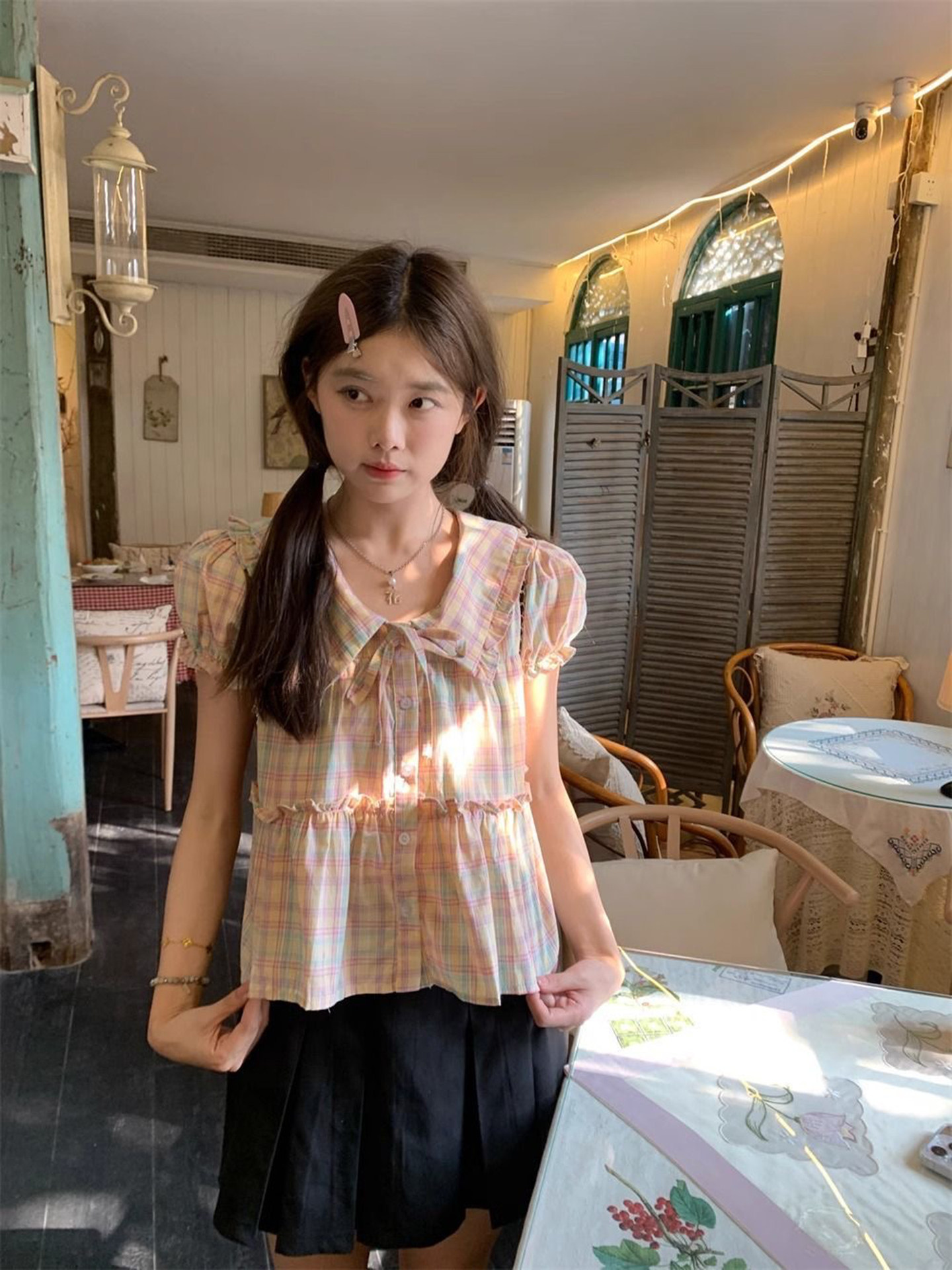 Áo sơ mi màu hồng được thiết kế búp bê cổ ngắn tay áo ngắn mùa hè người đàn ông nhỏ French xiaozi áo sơ mi xinh đẹp