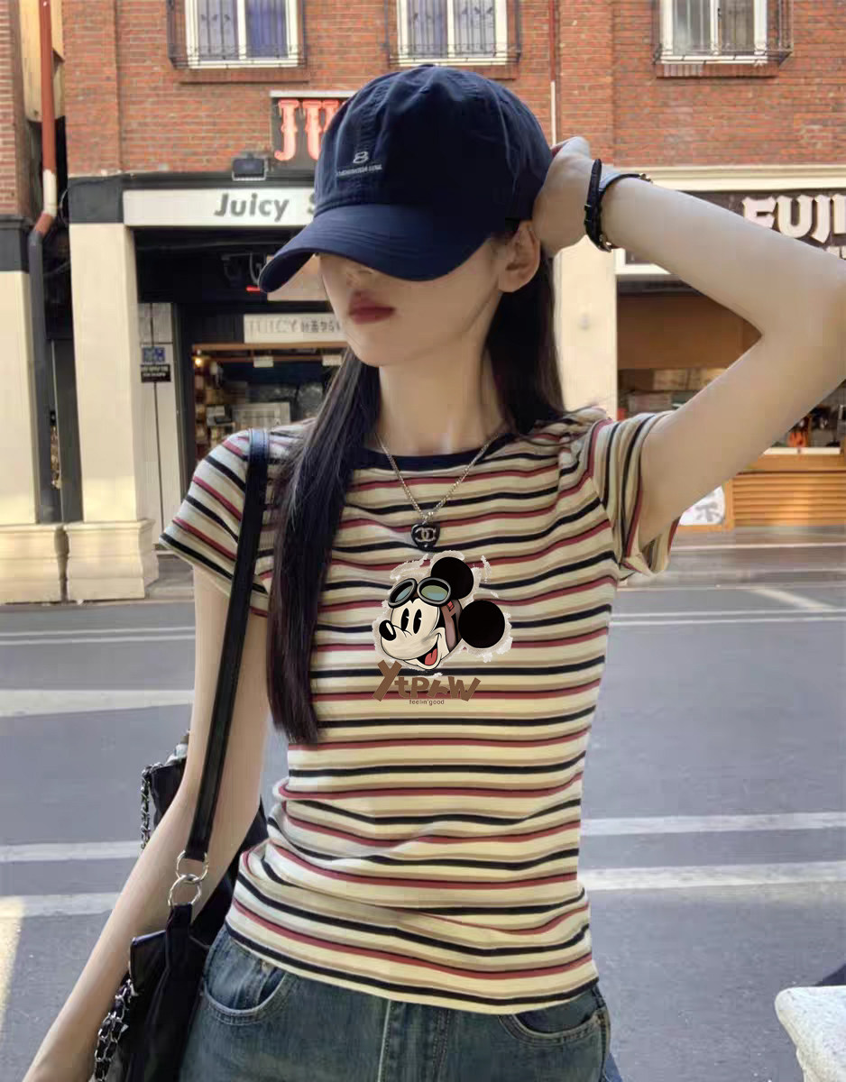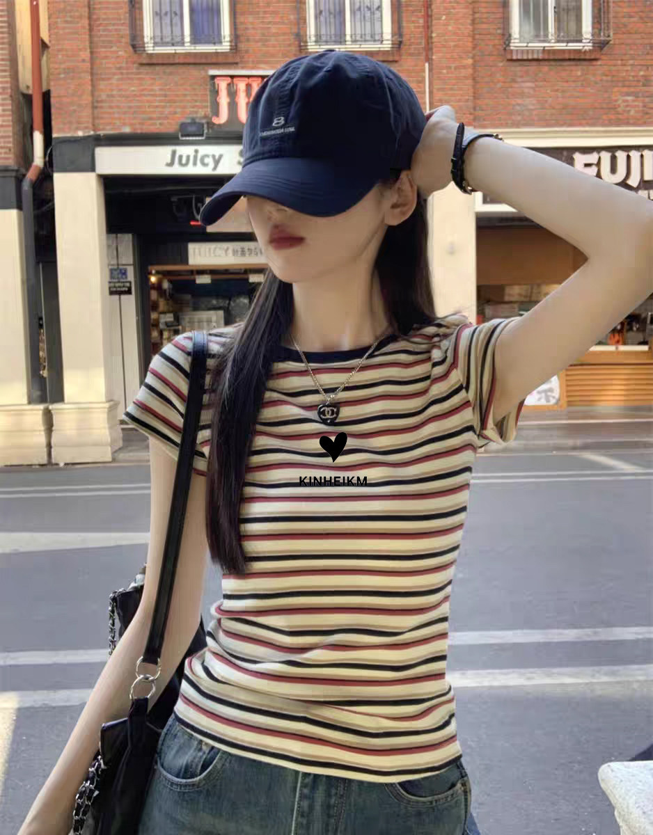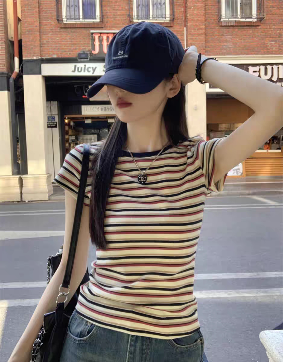 2025 Mùa hè sọc màu khối bông phải vai ngắn tay áo thun nữ thiết kế cao cấp phong cách phương Tây giảm tuổi hàng đầu