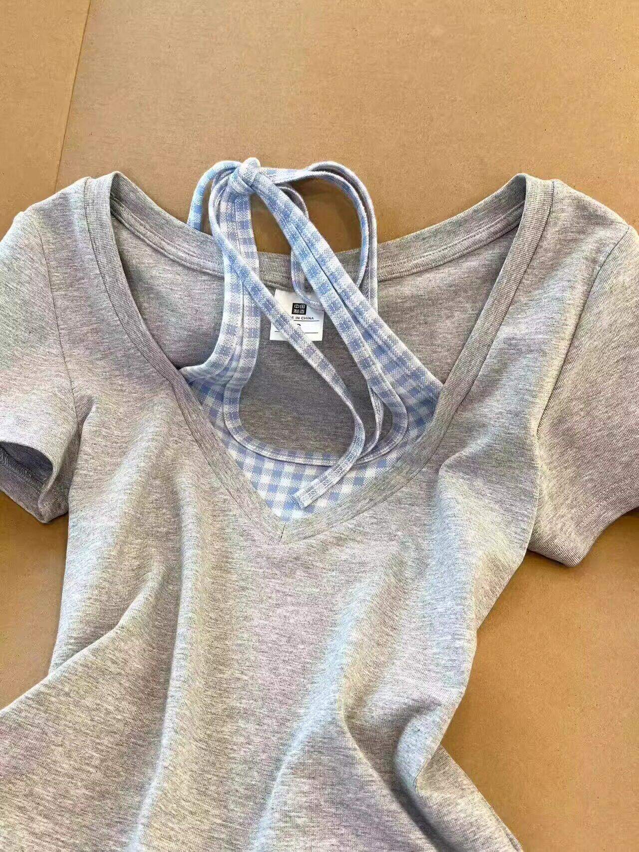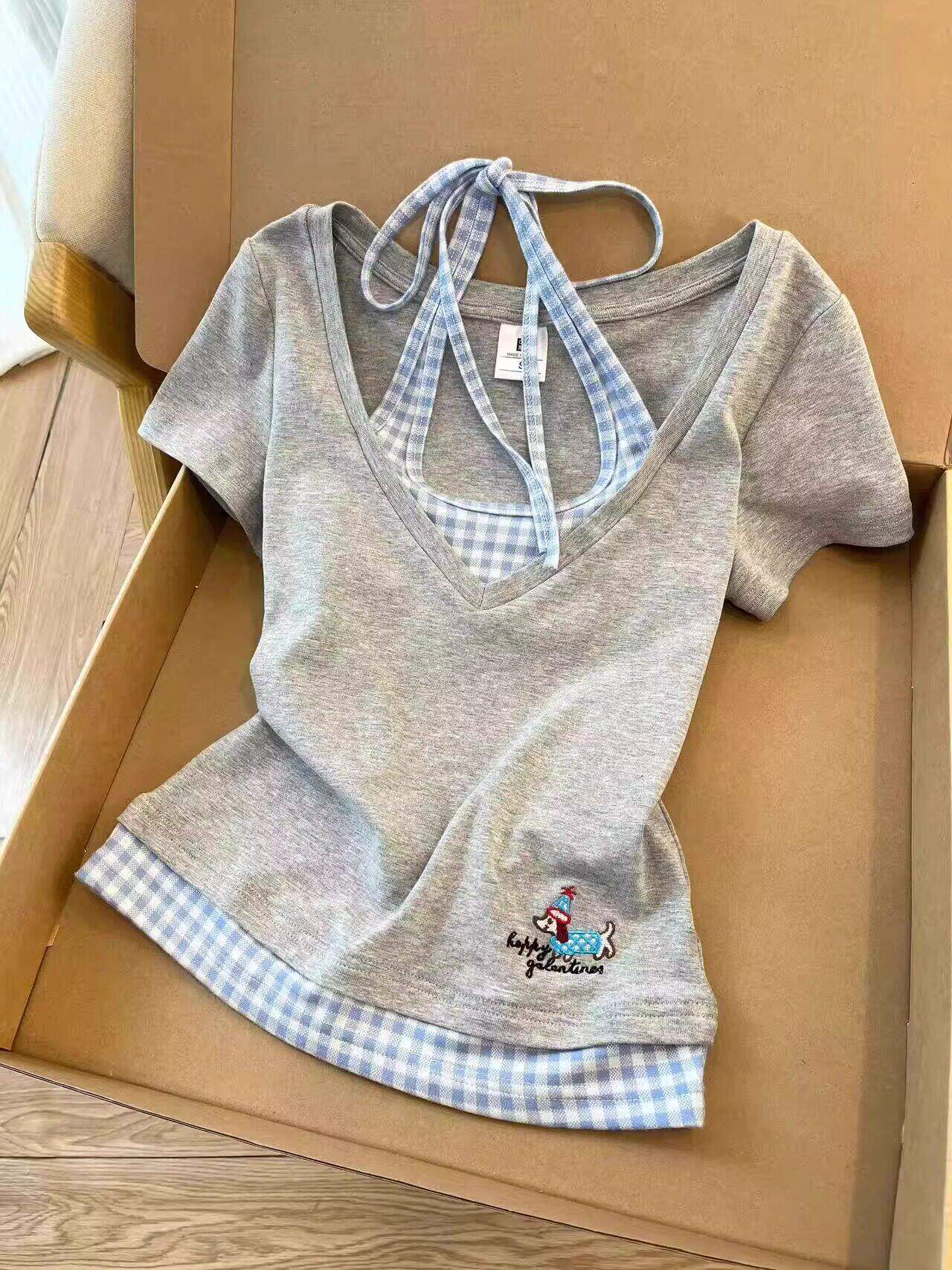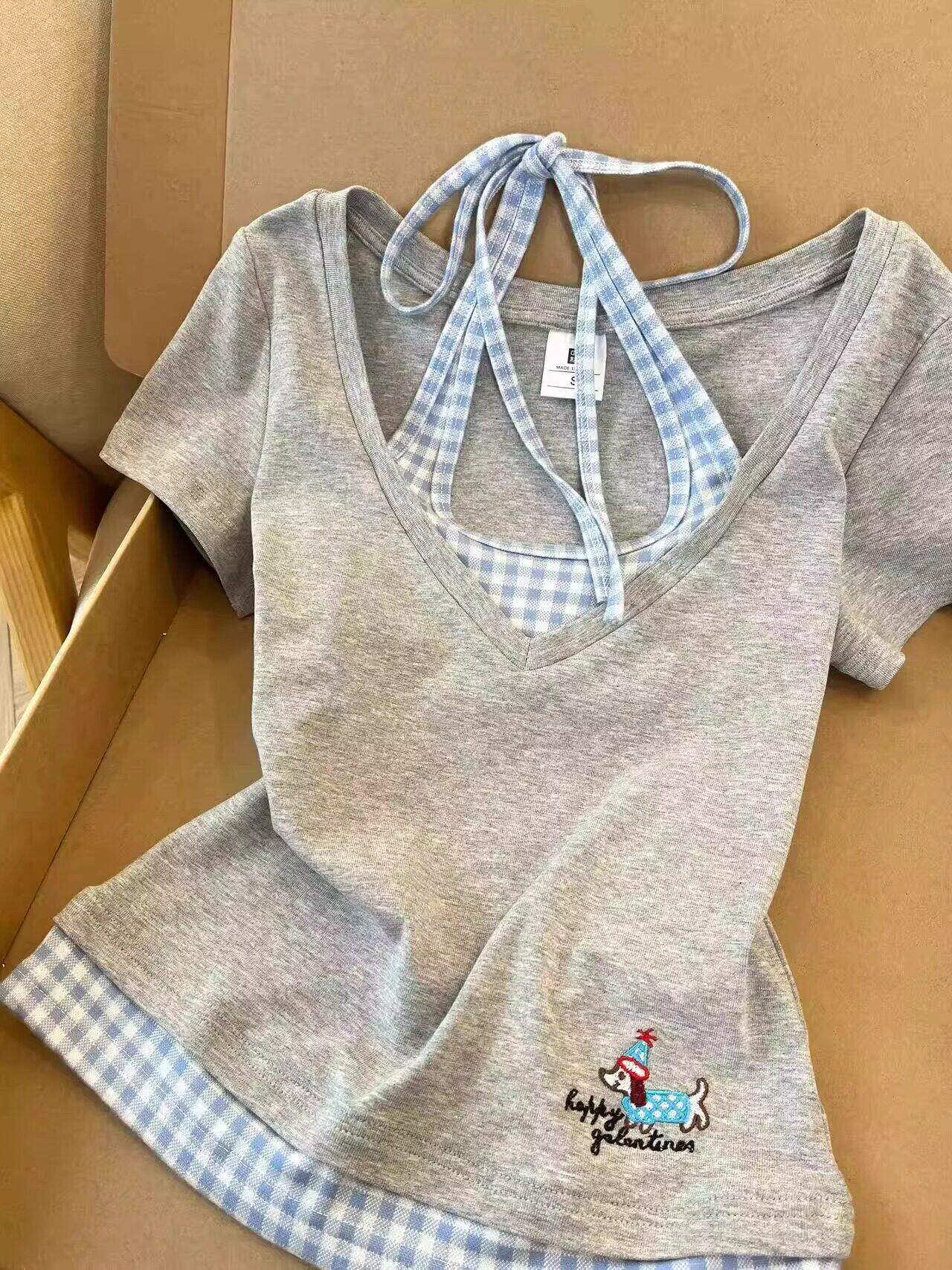 Thiết kế ít thêu giả hai áo cổ ngắn tay áo thun mùa hè cô gái slim đặc biệt thắt lưng áo ngắn