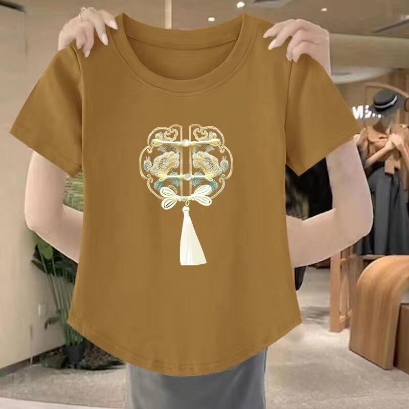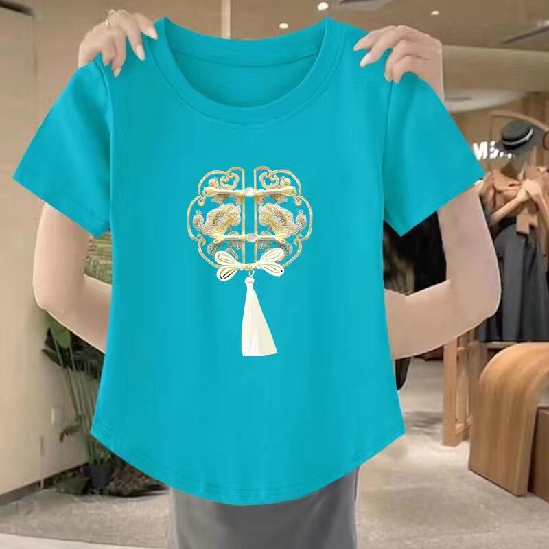 Áo thun ngắn tay kiểu Trung Quốc mới, kiểu dáng mới mùa hè, cổ tròn, cổ tròn, in hoa bất quy tắc.
