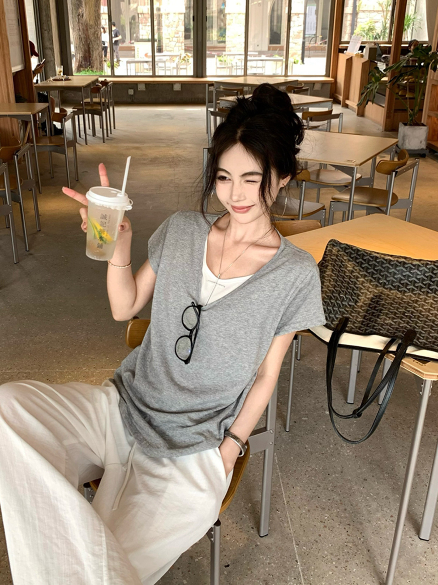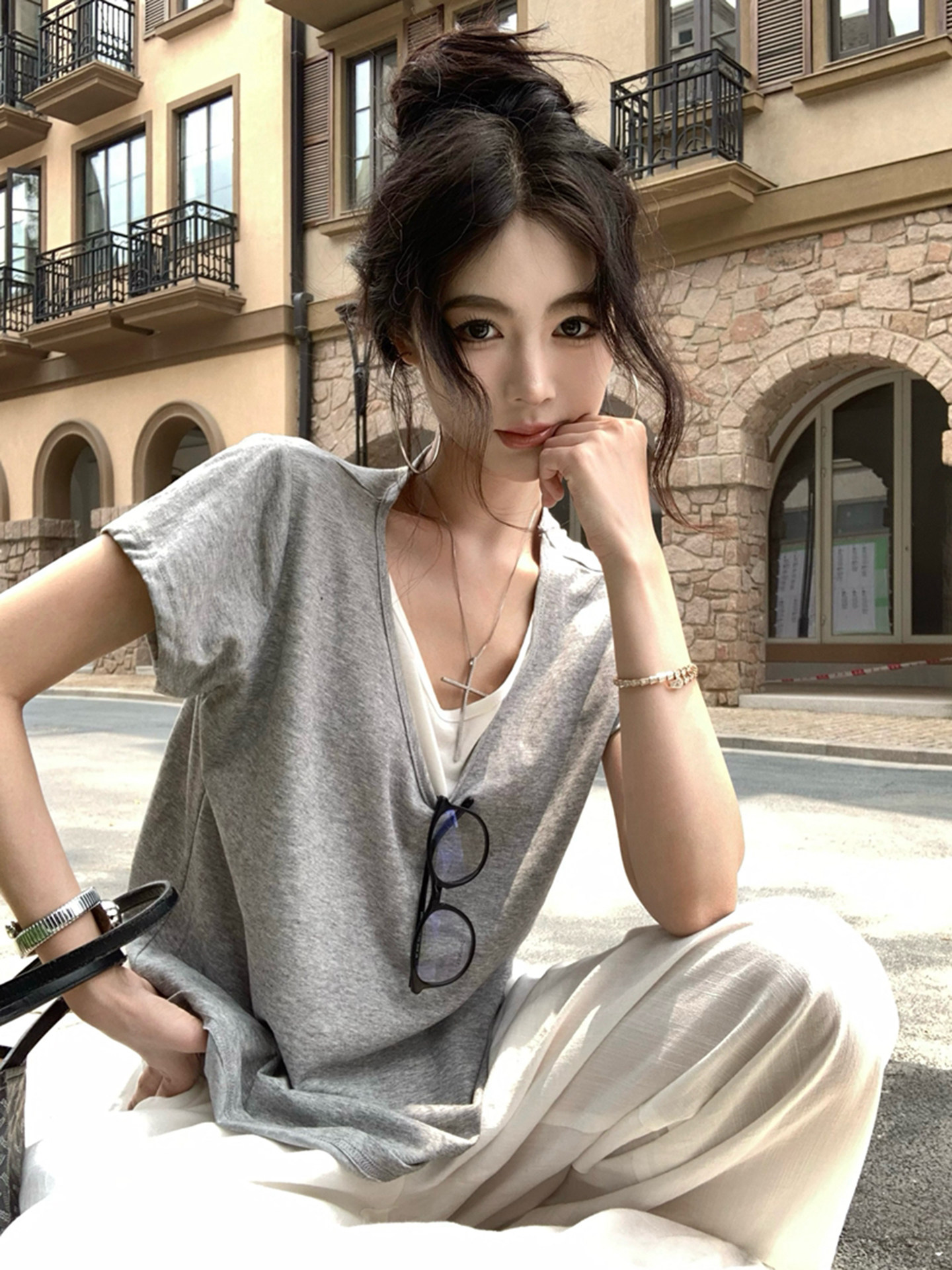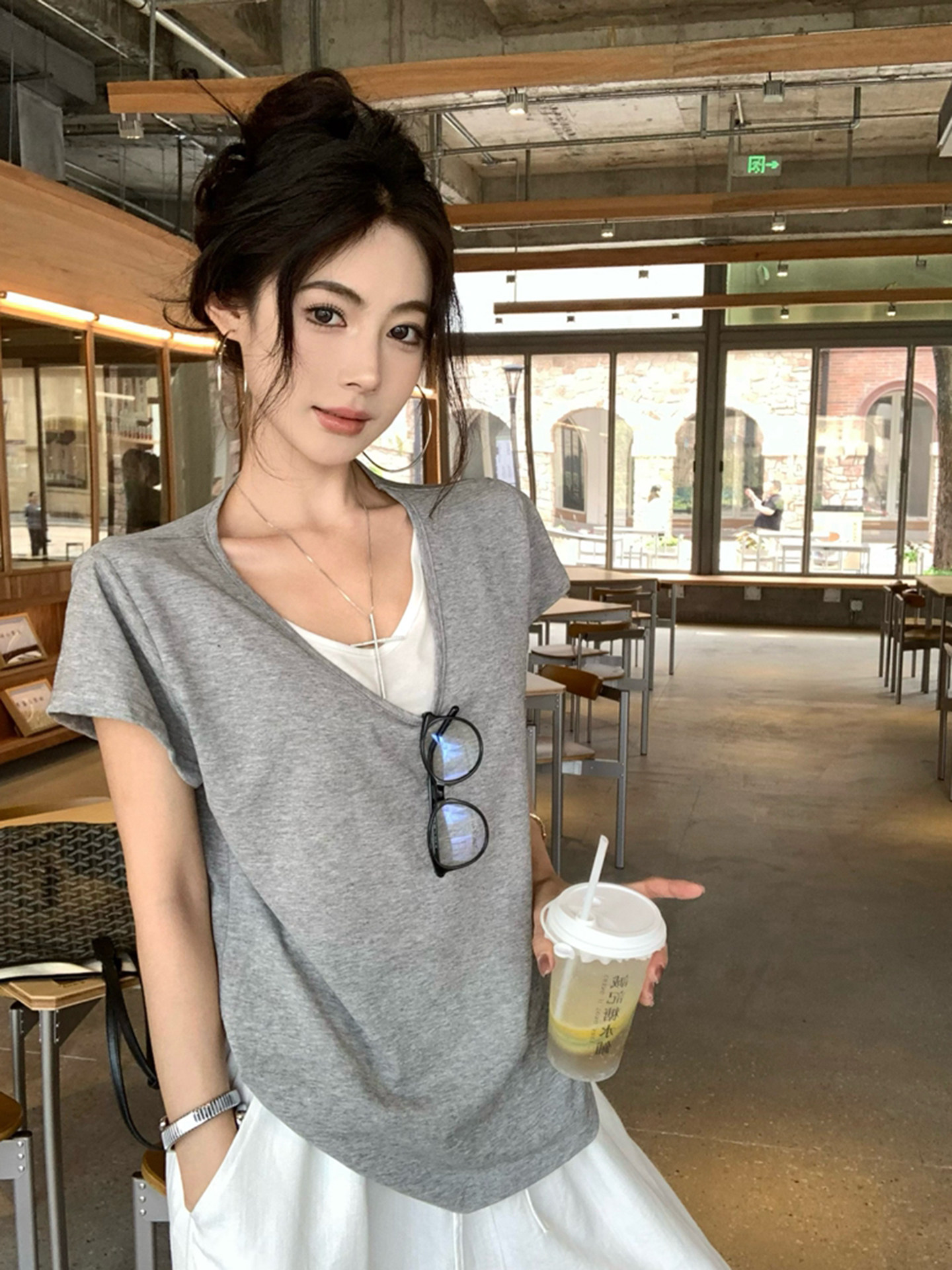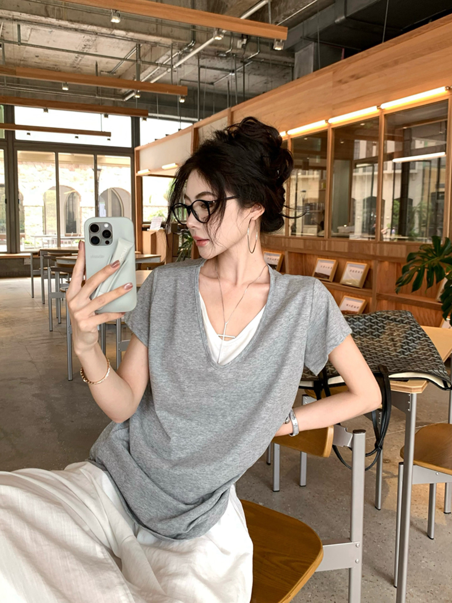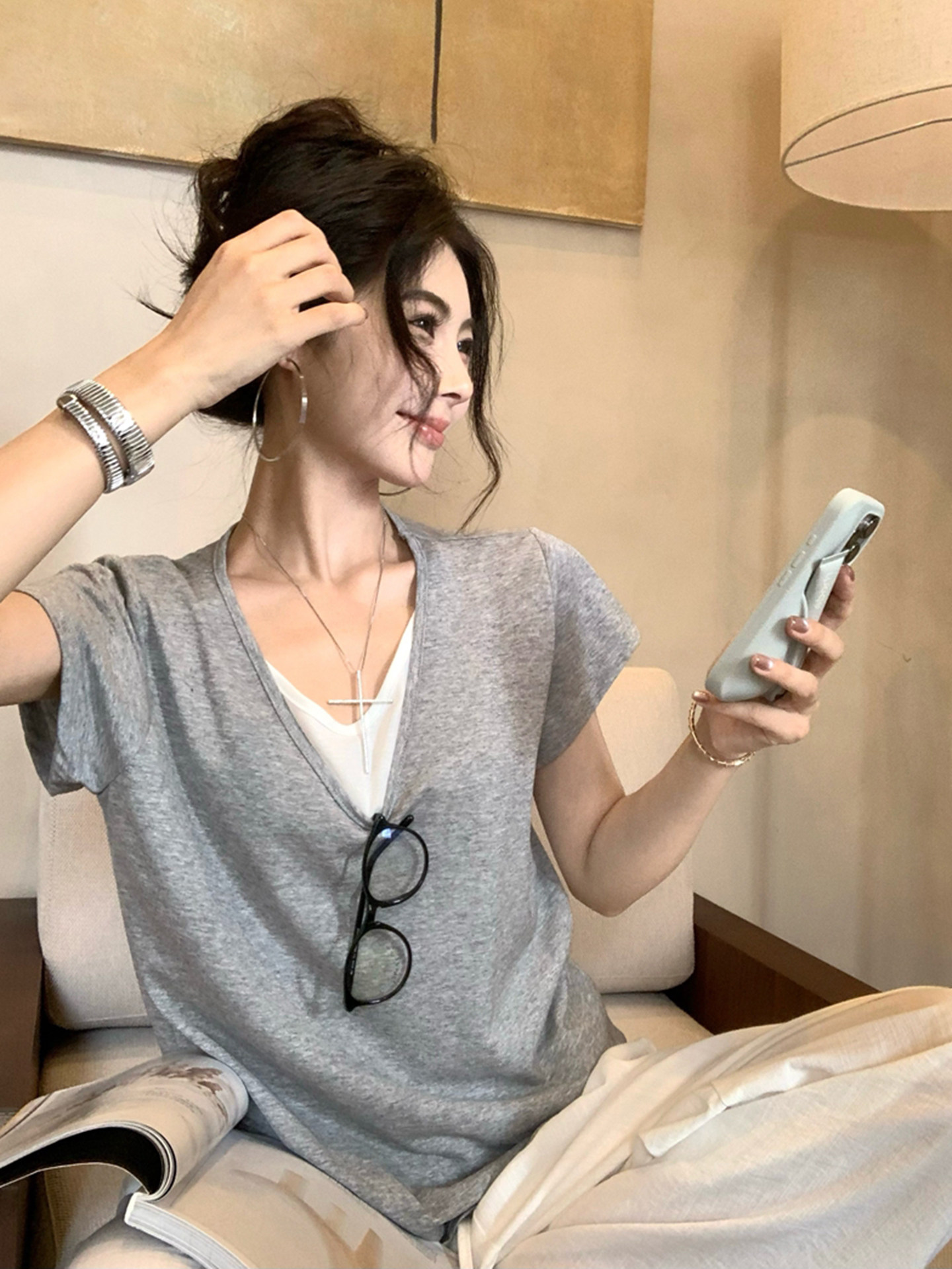 Giả hai áo sơ mi V cổ áo ngắn tay năm 2025 mùa hè mũm mĩm kích thước lớn, rộng, lười biếng mặc áo khoác