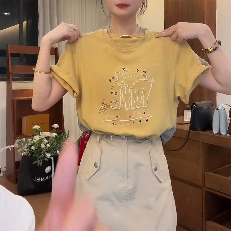 Thiết kế áo sơ mi miễn phí ngắn tay 2026 mùa xuân và mùa hè đầu mùa xuân mới thêu mẫu chữ cái của voi bông áo sơ mi